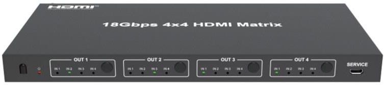 Matryca HDMI 4x4 z pełnym pasmem 18Gb/s, niezależne skalowanie 4k do 1080p na wszystkich wyjściach HDMI, obsługiwane rozdzielczości do 4K 60Hz (4:4:4), HDCP 2.2, zarządzanie EDID, wsparcie audio 7.1ch, HDR, HDR10, HDR10+i DV