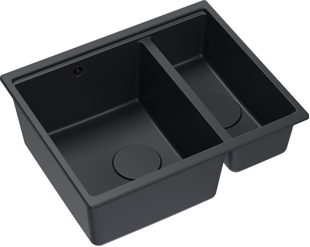 Quadron Logan 150 55,5x46 Czarny Mat Elementy Czarne HCQL5646U7BLMI Zlewozmywak Quadron Logan 150 to doskonałe rozwiązanie dla każdej kuchni, łączące w sobie estetykę oraz funkcjonalność. Dzięki swoim wymiarom i innowacyjnym materiałom, model ten zaspokaja potrzeby zarówno pod względem praktycznym, jak i wizualnym. Jego czarny matowy kolor oraz elegancki design sprawiają, że staje się centralnym punktem każdej aranżacji kuchennej. Wymiary i głębokość komory Wymiary tego modelu wynoszą 55,5 cm długości i 46 cm szerokości, co czyni go idealnym rozwiązaniem do mniejszych kuchni. Głębokość głównej komory wynosi 22 cm, a małej 16 cm, co przekłada się na dużą pojemność – aż 29 litrów w głównej komorze i 9 litrów w mniejszej. Te parametry zapewniają komfort w codziennym użytkowaniu, umożliwiając swobodne mycie większych naczyń oraz eliminując problem z rozpryskami wody. Materiał i typ zlewozmywaka Model Quadron Logan 150 jest 1,5 komorowy i wykonany z innowacyjnego materiału GraniteQ, który łączy w sobie granit i wysokiej jakości żywicę. Taki kompozyt nie tylko prezentuje się elegancko, ale również charakteryzuje się wyjątkową odpornością na zarysowania, wysoką temperaturę oraz działanie chemikaliów. Powierzchnia zlewu jest gładka i matowa, co ułatwia utrzymanie czystości oraz nadaje wnętrzu nowoczesnego i luksusowego charakteru. Granitowy materiał jest również higieniczny i odporny na przebarwienia, co sprawia, że model Logan 150 będzie służył przez długie lata. Funkcjonalności i zalety Wybierając zlewozmywak, warto zwrócić uwagę na jego funkcje i zalety. Oto kluczowe cechy tego modelu, które mogą znacząco wpłynąć na komfort codziennego użytkowania: ergonomiczny design: obniżona strefa użytkowania chroni blat przed wodą, a optymalne ukształtowanie zlewu ułatwia jego czyszczenie, co jest istotne w intensywnie użytkowanej kuchni, odporność na uszkodzenia: materiał GraniteQ jest odporny na zarysowania oraz działanie chemikaliów, co gwarantuje długotrwałe użytkowanie i zachowanie estetyki, estetyka: czarny kolor Pure Carbon oraz dopasowane akcesoria, takie jak odpływ i rozetka przelewu, podkreślają elegancki design, który wpasuje się w różnorodne aranżacje wnętrz, przestronność: głębokie komory zapewniają dużą pojemność, co ułatwia mycie większych naczyń i eliminuje konieczność częstego opróżniania zlewu, funkcjonalny syfon: możliwość podłączenia zmywarki lub pralki oraz zastosowanie technologii save space pozwala na oszczędzenie miejsca w szafce pod zlewem, co jest istotne w mniejszych kuchniach, prosty montaż: zestaw zawiera zaczepy mocujące, co ułatwia instalację i zapewnia stabilność. Rodzaj montażu i odstojnik Model Quadron Logan 150 jest przeznaczony do montażu wpuszczanego, co pozwala na estetyczne wkomponowanie go w blat kuchenny. Dodatkowo, zastosowany syfon o specjalnej płaskiej konstrukcji zajmuje mniej miejsca niż standardowy model, co jest ważne w kontekście efektywnego zarządzania przestrzenią pod zlewem. Dzięki temu rozwiązaniu, użytkownicy mogą cieszyć się większą swobodą w organizacji przestrzeni kuchennej, co jest istotne w mniejszych pomieszczeniach. Zlewozmywak Quadron Logan 150 to połączenie nowoczesnego wzornictwa z funkcjonalnością, które z pewnością zaspokoi potrzeby nawet najbardziej wymagających użytkowników. Jego elegancki wygląd, wysokiej jakości materiały oraz praktyczne rozwiązania sprawiają, że może stać się centralnym punktem każdej kuchni, nadając jej wyjątkowego charakteru.