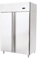 obudowa oraz wnętrze w całości wykonane z blachy nierdzewnej elektroniczne sterowanie z cyfrowym wyświetlaczem temperatury wyłącznik wentylatora po otwarciu drzwi chłodzenie nawiewowe (wymuszone wentylatorem) energooszczędny i cichy agregat skraplający automatyczne odszranianie automatyczne odparowanie skroplin półki rusztowe (metalowe plastyfikowane) samozamykające się drzwi regulowane nogi w zakresie do 50 mm klasa klimatyczna: 4 Informacje Ilość półek 6 Moc (kW) 0,741 Pojemność (l) 900 Waga (kg) 135 Wymiary (mm) 1200 x 745 x 1950 Zużycie energii (kWh/d) 8,5