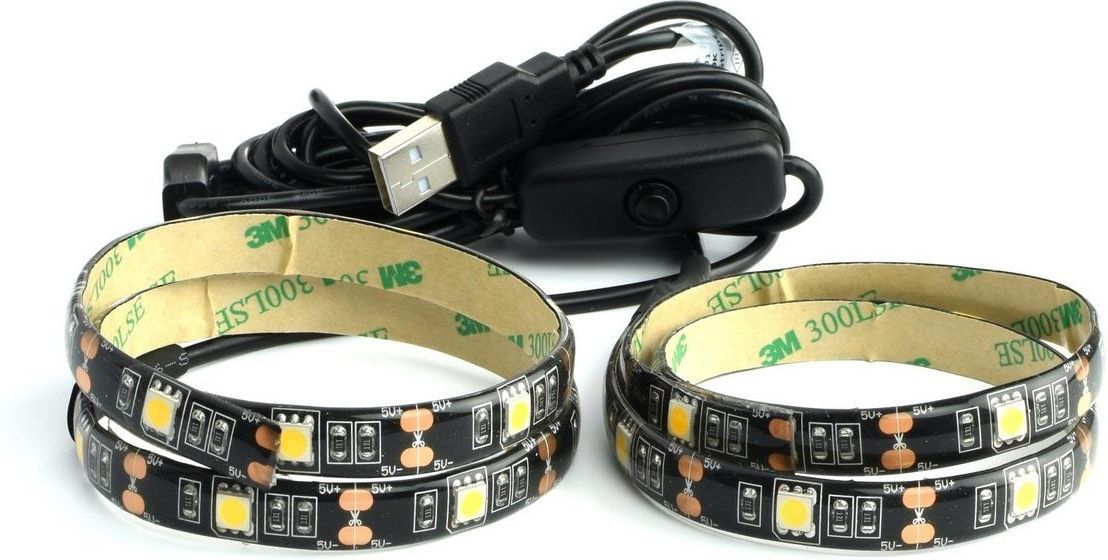 Biała taśma LED 2 x 50 cm do złącza USB. Idealna do podświetlania telewizorów i monitorów oraz do różnych podświetleń dekoracyjnych. Podłącza się do złącza USB telewizora. Paski LED mocuje się w wybranym miejscu za pomocą dwustronnej taśmy samoprzylepnej. Produkt zmniejsza zmęczenie podczas pracy z komputerem lub oglądania telewizji. Łatwa instalacja zajmuje tylko kilka minut, wszystkie niezbędne akcesoria są dołączone. 2 x 50 cm taśma LED (każda z 15 silnie świecącymi diodami LED) napięcie: 5 V (złącze USB) barwa światła: 4000 K (chłodna biel) zintegrowany włącznik żywotność: 30 000 godzin długość przewodu zasilającego: 50 i 200 cm klasa energetyczna: F długość przewodu zasilającego: 50 cm