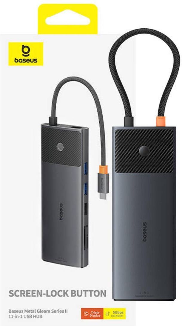 HUB USB 11w1 Baseus Metal Gleam Series II USB-A/USB-C PD/HDMI/DP/RJ45/SD/TF - czarny Przekształć swoje miejsce pracy w centrum wydajności z Baseus Metal Gleam Series II, hubem USB, który łączy w sobie elegancję z najnowocześniejszą technologią. Zapewniając możliwość podłączenia do trzech monitorów z ultrawysoką rozdzielczością 4K 60Hz, szybkie ładowanie Power Delivery 100W oraz transfer danych 5Gbps, ten hub jest kluczem do maksymalizacji produktywności bez kompromisów na prywatność dzięki przyciskowi wyłączania ekranu. Najważniejsze zalety Baseus Metal Gleam Series II 11-w-1 USB HUB: Multizadaniowość na nowym poziomie. Podłącz trzy monitory jednocześnie w trybie Triple Display i ciesz się przestrzenią roboczą bez ograniczeń. Obraz idealnie ostry. Oglądaj treści w rozdzielczości 4K 60Hz, ciesząc się niezrównaną jakością obrazu. Szybkie ładowanie. Korzystaj z funkcji Power Delivery 100W, aby Twoje urządzenie było zawsze gotowe do pracy. Transfer danych w mgnieniu oka. Przesyłaj dane z prędkością do 5 Gb/s, zapewniając szybkość i efektywność. Prywatność na wyciągnięcie ręki. Wyłączaj ekrany jednym kliknięciem na HUBie, dbając o swoją prywatność. Specyfikacja: Marka: Baseus Model: B00061801123-00 Kolor: Czarny Wejście zasilania: 5V / 3A, 9V / 3A, 15V / 3A, 20V / 5A Wyjście zasilania: 5V / 0.5A, 5V / 0.9A Rodzaj złącza: 2x HDMI 4K 60Hz 1x DisplayPort 4K 60Hz 2x USB-A 5Gb/s 2x USB-A 480Mb/s 1x RJ-45 1000Mb/s 1x SD/TF 104MB/s 1x USB-C PD 100W Triple display Połącz trzy monitory naraz, aby uzyskać przestrzeń roboczą bez ograniczeń. Idealne rozwiązanie dla osób, które potrzebują więcej miejsca do pracy lub chcą cieszyć się grą na wielu ekranach bez utraty jakości obrazu. Jakość 4K 60Hz Ultra Clarity Zapewnij sobie niezrównaną jakość obrazu dzięki wsparciu dla rozdzielczości 4K przy 60Hz. Odkryj najdrobniejsze szczegóły i ciesz się płynnością obrazu bez zakłóceń. Power Delivery 100W Szybkie ładowanie do 100W gwarantuje, że Twoje urządzenia są zawsze gotowe do działania. Niezależnie od tego, czy pracujesz, czy grasz, możesz polegać na ciągłej dostępności energii. Transfer danych 5 Gb/s Przesyłaj dane z prędkością do 5Gbps, korzystając z portów USB-A. Zapewnia to szybką i efektywną wymianę plików, co jest kluczowe w pracy z dużymi ilościami danych. Prywatność jednym kliknięciem Przycisk wyłączania ekranu zapewnia szybką ochronę prywatności, umożliwiając natychmiastowe wyłączenie monitorów. Idealne rozwiązanie dla zachowania poufności w miejscu