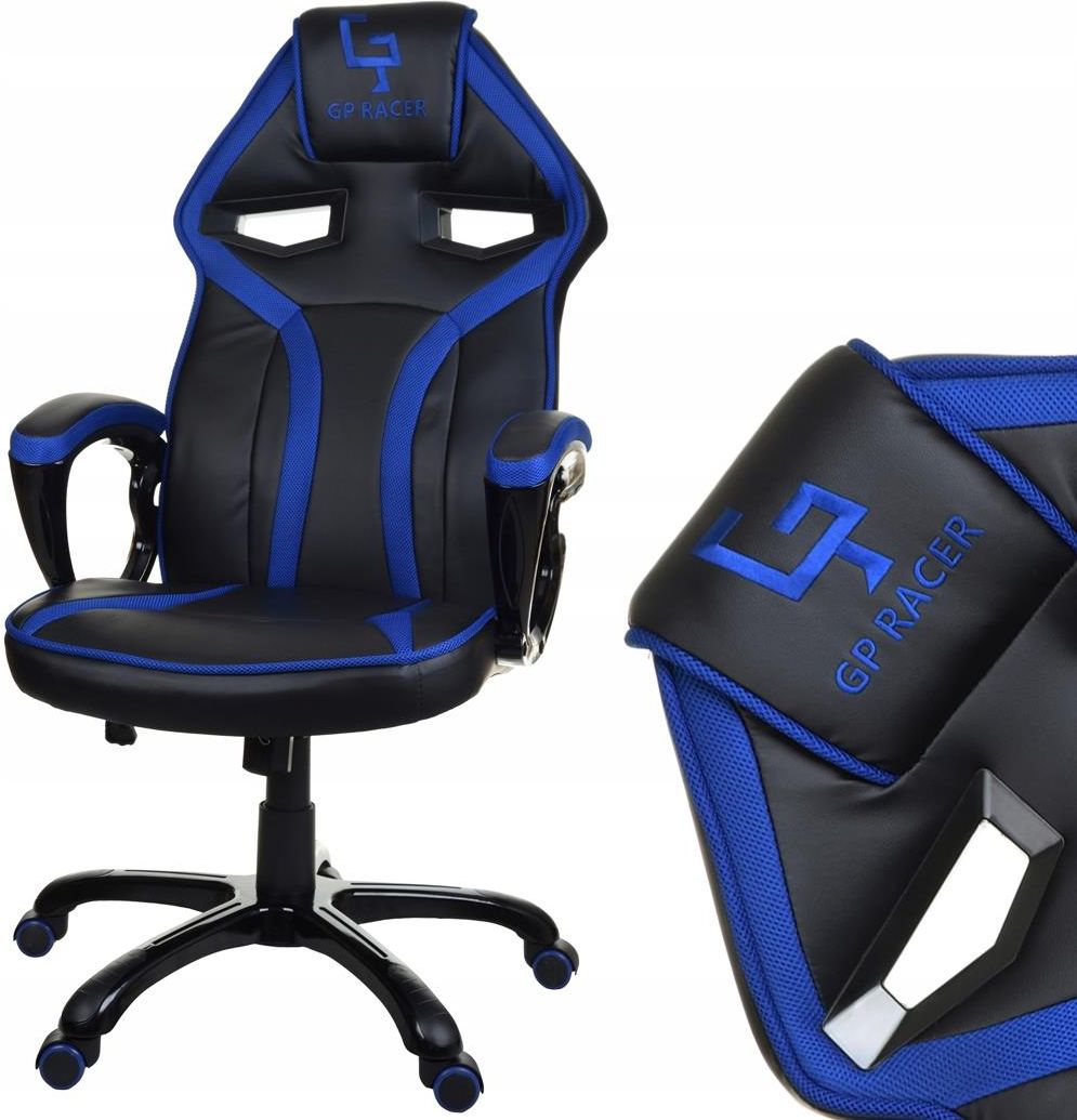 Fotel gamingowy GP Racer czarno-niebieski. Obrotowy, nowoczesny fotel dla gracza Giosedio GP Racer wykonany ze skóry ekologicznej w kolorze czarnym oraz niebieską siatką membranową. Fotel jest wygodny, posiada wspieranie lędźwi. Zaopatrzony został w mechanizm TILT umożliwiający odchylanie fotela …