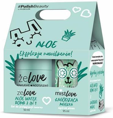 Zestaw Flos-Lek zawiera: 1.Flos-Lek Aloe żeLOVE, żel do twarzy 2w1, 50 ml. 2.Flos-Lek Aloe mistLOVE, łagodząca mgiełka, 95 ml. 1. Flos-Lek Aloe żeLOVE, żel do twarzy 2w1, 50 ml: Flos-Lek Aloe żeLOVE, żel do twarzy 2w1 to kosmetyk o orzeźwiającym zapachu zielonego ogórka przeznaczony jest do pielęgnacji skóry twarzy, szyi i dekoltu. Żel działa łagodząco na przesuszoną i ściągniętą skórę. Sprawdzi się idealnie na przykład po wysiłku fizycznym w celu ochłodzenia cery. Zastosowanie Dla nawilżenia przesuszonej skóry. Jako baza pod make-up. Sposób użycia Stosuj żel dowolnie, na skórę twarzy, szyi i dekoltu. Używaj rano i wieczorem. Produkt może być stosowany tak często jak jest to potrzebne, jako nawilżająca maseczka. Składniki (INCI) Aqua, Isopentyldiol, Glycerin ( gliceryna ), Dipropylene Glycol, Aloe Barbadensis Leaf Juice ( ekstrakt z aloesu ), Cucumis Sativus Extract ( ekstrakt z ogórka ), Panthenol ( panteno l), Carbomer, Sodium Acrylate/Sodium Acryloyldimethyl Taurate Copolymer, Isohexadecane, Polysorbate 80, Sorbitan Oleate, Triethanolamine, Parfum, Ethylhexylglycerin, Caprylhydroxamic Acid, Potassium Sorbate, Sodium Benzoate, CI 47005, CI 42090, Sodium Sulfate. 2. Flos-Lek Aloe mistLOVE, łagodząca mgiełka, 95 ml: Flos-Lek Aloe mistLOVE, łagodząca mgiełka może być stosowana nawet kilka razy dziennie w zależności od potrzeb, na włosy, skórę twarzy i ciała. Idealnie sprawdzi się jako alternatywa dla toniku, baza pod makijaż lub oczyszczająco przed nałożeniem kremu. Zawarty w składzie ogórek działa nawilżająco, zapewnia uczucie świeżości oraz ochłodzenia. Zastosowanie W celu odświeżenia i ochłodzenia skóry. Wygładzająco na odstające kosmyki włosów. Dla nawilżenia skóry całego ciała. Sposób użycia Wstrząśnij przed użyciem. Rozpyl mgiełkę na twarz, dekolt, włosy oraz ciało. Czynność można powtarzać według potrzeb. Składniki (INCI) Aqua, Glycerin ( gliceryna ), Aloe Barbadensis Leaf Juice ( ekstrakt z aloesu ), Cucumis Sativus Extract ( ekstrakt z ogórka ), Polysorbate 20, Sodium Phytate, Citric Acid, Parfum, Sodium Benzoate, Potassium Sorbate, Sodium Sulfate, CI 42090, CI 47005.