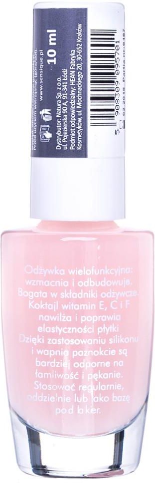 Odżywka wielofunkcyjna: wzmacnia i odbudowuje. Bogata w składniki odżywcze. Koktajl witamin E, C i F nawilża i poprawia elastyczności płytki. Dzięki zastosowaniu silikonu i wapnia paznokcie są bardziej odporne na łamliwość i pękanie. Stosować regularnie, oddzielnie lub jako bazę pod lakier.