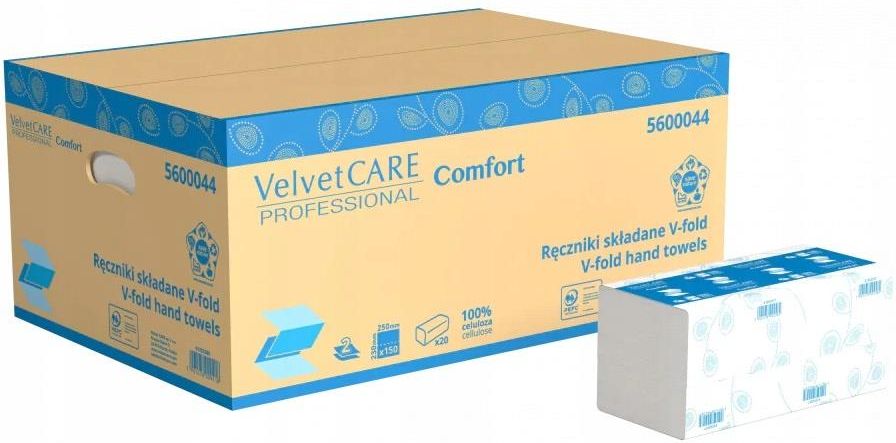 Ręczniki papierowe składane Velvet V Fold (ZZ) Comfort 25x23 (100% celulose) 5600044 Oferta dotyczy: Ręczniki papierowe składane A'3000 V-Fold ZZ (100% celuloza) Ręcznik papierowy Velvet jest produktem, który z pewnością trafi w gusty nawet najbardziej wymagających klientów. Wykonany w 100% z celulozy może być używany jako ręcznik do rąk lub papierowe czyściwo. Charakteryzuje się wytrzymałością, chłonnością i funkcjonalnością w różnych sytuacjach. Niezastąpiony w kuchniach, salonach fryzjerskich i kosmetycznych, salonach tatuażu, w solariach, warsztatach, różnego rodzaju zakładach produkcyjnych, itp. Dwuwarstwowy, higienicznie pakowany ręcznik jest produktem bardzo wysokiej jakości - nie traci swej wytrzymałości nawet po dość mocnym namoczeniu wodą. Specyfikacja produktu: liczba warstw: 2 wymiar listka: 250x230 ilość listków w opakowaniu jednostkowym: 150 (opakowanie zbiorcze karton 20 szt.) Oferta Velvet CARE Professional obejmuje zwijane i składane produkty papierowe wykonane w 100% z celulozy bądź selekcjonowanej makulatury. Swoją jakość zawdzięczają nowoczesnym liniom przetwórczym i wysokogatunkowym surowcom oraz ciągłym inwestycjom w rozwój i innowacje. 120 lat tradycji, wiedzy i doświadczenia zdobytego na rynku konsumenckim, pozwoliło firmie Velvet CARE wkroczyć z kolejną marką w zupełnie nowy obszar działalności, dedykowany szerokiej grupie nabywców instytucjonalnych (przemysł, obiekty użyteczności publicznej). Velvet CARE Professional to połączenie cenionej od lat wysokiej jakości produktów oraz technologii, spełniających oczekiwania nawet najbardziej wymagających klientów. SPECYFIKACJA PRODUKTU V Fold Comfort (100% celulose) 150szt. Zapach - Bez zapachu Kolor - Biały Nadruk - Brak Łączenie warstw - Warstwy klejone Powierzchnia - Tłoczony wzorek Skład surowcowy - Bibułka tissue - wyprodukowana w 100 % z masy celulozowej siarczanowej ECF, która jest substancja naturalną, niemodyfikowaną. Klej do łączenia warstw Opakowanie jednostkowe - Banderola biała z nadrukiem Opakowanie zbiorcze - Karton zbiorczy szary z naklejką ITF – klapowy – 20 sztuk w kartonie Sposób przechowywania - Przechowywać w pomieszczeniach suchych i przewiewnych.