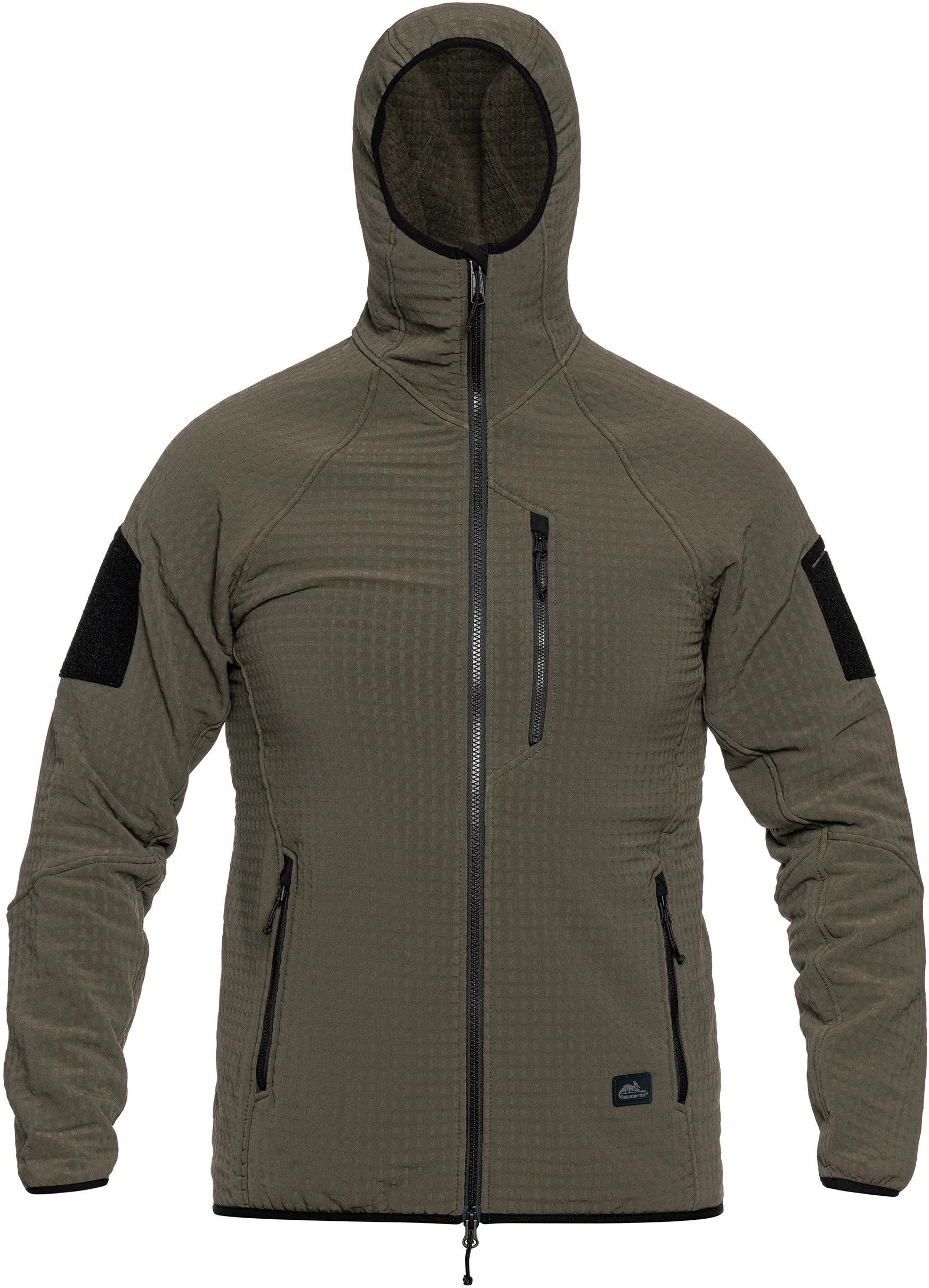 Polar Helikon Patriot Pro - Taiga Green XXL (BL-PPF-RP-09-B07) Styl odzieży: Trekkingowy Kolor/kamuflaż: Odcienie zieleni Typ materiału: Syntetyczny Gramatura: 256 g/m2 Rodzaj rozpięcia: Zamek błyskawiczny Kaptur: Tak Materiał główny: 100% poliester Liczba kieszeni: 5 Kolor główny: Taiga Green Panel velcro: Tak Płeć: Męska Faktura materiału: Fleece Elastyczność materiału: Nierozciągliwy Kod producenta: BL-PPF-RP-09-B0 Producent: Helikon Zielona bluza z kapturem wykonana z nowoczesnej tkaniny StormFleece, łączącej cechy ciepłego polaru i lekkiego softshella, to idealna propozycja dla poszukujących ochrony przed chłodem w codziennym użytkowaniu, podczas wędrówek i aktywności na świeżym powietrzu. Dwuwarstwowy materiał zapewnia wysoką ochronę termiczną przy lekkiej konstrukcji. Tkanina StormFleece łączy właściwości ciepłego polaru i lekkiego softshella, oferując komfort i ochronę. Zewnętrzna warstwa z elastycznego materiału przypominającego softshell dba o oddychalność i elastyczność, a wewnętrzna warstwa z miękkiego polaru świetnie zatrzymuje ciepło. Materiał schnie szybko, jest przyjemny dla skóry i zapewnia izolację przy niskiej wadze. Bluza wyposażona w pięć kieszeni: dwie boczne, jedną na piersi i dwie wewnętrzne, zamykane na solidne zamki YKK z trokami, co ułatwia obsługę nawet w rękawicach. Kaptur dobrze przylegający z osłoną szyi oraz panele velcro na ramionach umożliwiają mocowanie naszywek. Dwukierunkowy zamek YKK i elastyczne lamówki zapewniają dopasowanie oraz dodatkową ochronę przed chłodem. Najważniejsze cechy: Tkanina StormFleece łącząca zalety dwóch typów odzieży Dwuwarstwowa konstrukcja dla ciepła i lekkości Zewnętrzna warstwa przypominająca softshell Wewnętrzna warstwa z ciepłego polaru o gramaturze 256 g/m2 Dopasowany kaptur chroniący głowę Stójka chroniąca szyję Zamki YKK z trokami zwiększającymi wygodę Panele velcro na ramionach Laserowo wycinane przelotki na akcesoria 5 praktycznych kieszeni