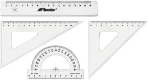 pomoce geometryczne szkolne : linijka , 2 ekierki i kątomierz wykonany z przeźroczystego tworzywa podcięcie do kreślenia tuszem zestaw kreślarski zawiera 4 szt: ekierka 45o 10cm (nr 10022) ekierka 60o14cm ( nr 10023) kątomierz 180o 10cm (nr 21003) linijka przeźroczysta 16 cm ( nr 20301)opakowanie: etiu foliowe