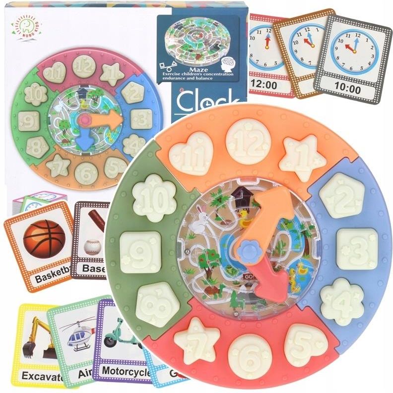 Wielofunkcyjny edukacyjny zegar wraz z sorterem i labiryntem. Zadaniem dziecka jest wyszukanie takich samych kształtów (otworu i klocka) i umieszczenie w nich wszystkich klocków na zasadzie sortera. W zestawie znajduje się 12 białych klocków w różnych kształtach, z liczbami od 1 do 12 oraz 4 większe kolorowe klocki, na których układamy te mniejsze. W środku zegara, na okrągłym klocku znajdują się wskazówki, a pod nimi labirynt z dwoma kuleczkami, który zainteresuje każdego. Do pomocy nauki obsługi zegara zostały dodane karteczki z ilustrowanymi godzinami, a po drugiej stronie tematycznie ułożone zwierzątka, owoce, pojazdy oraz piłki używane w danym sporcie. Układanka podczas zabawy łączy ze sobą naukę, rozwój oraz zapewni wiele radości każdemu dziecku. Doskonale ćwiczy spostrzegawczość oraz pamięć, uczy kształtów, kolorów oraz liczb. W zestawie 5 klocków jako podstawa zegara labirynt 12 klocków 24 karty Cechy produktu Sugerowany minimalny wiek (według informacji podanej przez producenta na opakowaniu): 3 lata + Wymiary ułożonego zegara: 22 (szer.) x 22 (gł.) x 3,5 (wys.) cm Ilość elementów: 41 Wymiary białego klocka ok.: 2,5 x 3 cm Wymiary labiryntu: 11 (szer.) x 11 (gł.) x 3 (wys.) cm Wymiary opakowania: 26,5 (szer.) x 3,5 (gł.) x 26,5 (wys.) cm nr kat. CH-229972 Informacja od producenta: Nie nadaje się dla dzieci w wieku poniżej 36 miesięcy. Zawiera małe części, które łatwo połknąć lub które mogą się dostać do dróg oddechowych. Niebezpieczeństwo uduszenia.