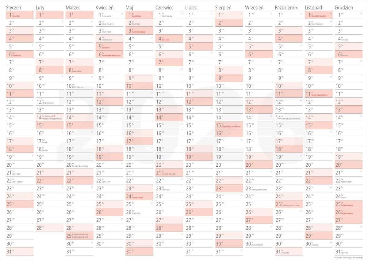Planer suchościeralny kalendarz ścienny na rok 2026 Format A1 wielkość całego arkusza: szerokość 84cm, wysokość 59cm - sprawdź na swojej ścianie miarką, czy taki właśnie jest Ci potrzebny :) zaznaczone dni wolne od pracy, święta państwowe i kościelne oraz zwyczajowe święta m.in. Dzień Babci i Dziadka, Dzień Kobiet, Dzień Matki, Dzień Dziecka numerowane tygodnie pole na notatki przy każdym dniu wielkość pola na notatki szerokość: 64mm, wysokość: 18mm możliwość wielokrotnej zmiany zapisków jeśli użyjesz markerów suchościeralnych - po prostu zetrzyj wilgotną ściereczką to co napisałeś i napisz nowy tekst jeśli nie chcesz zmieniać tekstu- możesz pisać po kalendarzu zwykłym markerem lub foliopisem w komplecie otrzymujesz komplet 6 kółeczek specjalnej taśmy dwustronnej do mocowania kalendarza, która nie pozostawia śladów Zastosowania kalendarza rocznego 119x84 cm format A0 na rok 2026 planowanie grafików, zajęć szkolnych, pozaszkolnych, dyżurów zapisywanie wydarzeń domowych, urlopów i in. dla szpitali, w przychodniach, gabinetach lekarskich, szkołach, uczelniach, biurach, instytucjach, w domu i in. Surowiec: Papier + laminat suchościeralny