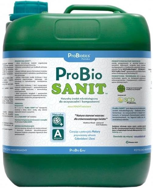 ProBio SANIT jest dopuszczony do obrotu jako środek mikrobiologiczny - bioaktywator procesu fermentacji na oczyszczalniach i w trakcjach ściekowych, w komorach fermentacyjnych, szambach, kompostowniach, na lagunach osadów oraz do neutralizacji odorów. DZIAŁANIE ProBio SANIT™: ułatwia mineralizację materii organicznej i poprawia proces kompostowania, detoksykuje z pozostałości po środkach ochrony roślin, aktywuje i stabilizuje proces fermentacji ścieków bytowych, komunalnych i odcieków z przetwórstwa rolno-spożywczego, stabilizuje i higienizuje osady ściekowe i inne pochodzenia organicznego ułatwiając ich mineralizację, a w konsekwencji zmniejszenie objętości, udrażnia trakcje ściekowe i sieci rozsączające oczyszczalni przydomowych i przyzakładowych ułatwiając rozkład tłuszczów i mineralizację resztek organicznych, ułatwia oczyszczanie urządzeń i powierzchni zabrudzonych i zatłuszczonych (separatory tłuszczu, osadniki, posadzki, studzienki, przepompownie). neutralizuje odory. Sposób użycia: Kompostowanie od 1 do 10 litrów ProBio SANIT/m3 kompostu rozcieńczyć w takiej ilości wody aby równo rozprowadzić roztwór w pryzmie Bioremediacja gleby opryski 5% do 10% roztworem ProBio SANIT. 120l-200l/ha, lub 3l-5l/m3 ziemi. Detoksykacja gleby 80l – 150l/ha w postaci 10% oprysku Szamba 0,5l – 2l ProBio SANIT/m3 ścieków Higienizacja i biologizacja pomieszczeń i narzędzi 5 – 20% roztwór ProBio SANIT. Opakowanie: 10 L