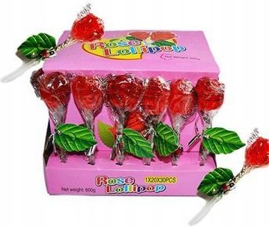 Rose Lollipop Lizak Róża 30szt x 20g Rose Lollipop - Pyszne lizaki w kształcie róż, które przypadną do gustu małej jak i dużej damie:) W opakowaniu zbiorczym znajdziemy 30 sztuk. Jest to idealna propozycja dzięki której sprawisz uśmiech na twarzy nie tylko dziecka, ale również wybranki Twojego serca:) TOTALNY MUST HAVE ! Walentynki Urodziny Dzień Kobiet Dzień Matki Dzień Babci i Dziadka Waga opakowania: 600 g Waga sztuki: 20 g Wymiary lizaka (długość całkowita z patyczkiem x szerokość x wysokość): ok. 10-11 cm x 3,0 cm x 3,5 cm UWAGA! Produkt ten posiada co najmniej trzymiesięczny termin ważności, w innym przypadku poinformujemy o tym klienta przed nadaniem paczki.