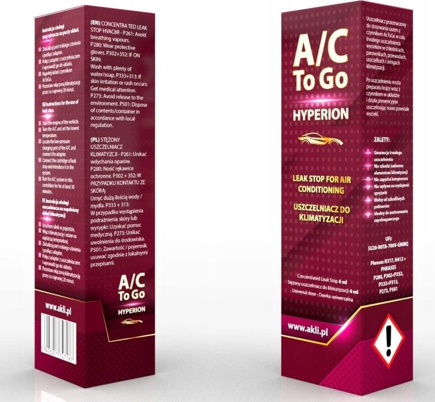 Uszczelniacz zawiera aplikator na "nowy gaz" R1234yf Uszczelniacz do układów klimatyzacji samochodowej przeznaczony do usuwania wycieków w każdym elemencie klimatyzacji. Środek silnie skondensowany dzięki czemu wykrywa i uszczelnia trwale wycieki do 0,3 mm. Działa ze wszystkimi typami kompresora. Zalety Efekt trwałego uszczelnienia Produkt jest kompatybilny z czynnikiem AcToGo R1234yf Nie szkodzi żadnemu elementowi klimatyzacji (brak polimerów) Nie zapycha kompresora Nie wpływa na wydajność sprężarki Idealny do zastosowania zapobiegawczego Opakowanie zawiera 6ml preparatu. W zestawie z elastycznym aplikatorem dzięki któremu podłączymy się nawet do najciężej dostępnych portów serwisowych czego nie zapewniają zwykłe plastikowe adaptery. Dodatkowo aplikator posiada zabezpieczenie w postaci zaworu jednokierunkowego dzięki któremu uzyskujemy dwie rzeczy: Możemy aplikować uszczelniacz na układ który jest już nabity czynnikiem. Nie ma niebezpieczeństwa przed wyciekiem czynnika z instalacji. Uszczelniacz AcToGo zyskał popularność na całym świecie i odniosły ogromny sukces w branży chemii motoryzacyjnej. Jesteśmy jedynym przedstawicielem w Polsce. Jak należy aplikować uszczelniacz przedstawiamy w filmie instruktażowym na kanale YT pod hasłem Jak napełnić klimatyzację w samochodzie? Zestaw do samodzielnego nabijania klimatyzacji AcToGo