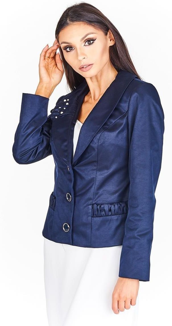 Żakiet uszyty z satyno-bawełny o delikatnym połysku. Na przodzie cięcia francuskie. Kołnierz bardzo dekoracyjny, ozdobiony marszczeniem i perełkami z prawej strony. Górne krawędzie kieszeni również posiadają podobne marszczenia. Rękaw długi. Jest podszewka. Zapinany na 3 duże guziki. Żakiet idealnie komponuje się z sukienką o numerze FSU634, razem tworzą elegancką garsonkę. Komplet można założyć na wiele rodzinnych i biznesowych spotkań, jak również na co dzień do pracy biurowej. PRODUKT POLSKI kupując polskie marki wspierasz rozwój rodaków. Polska rośnie w siłę.