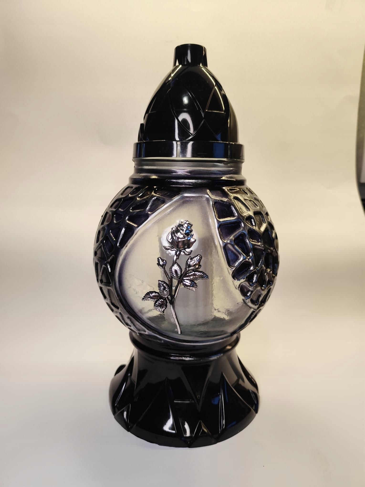Kula – Szklany znicz z Różą+ wkład Pięknie wykonany szklany znicz z dodatkami w kolorze srebra . Lampion jest ciężki i solidny, a szeroka podstawa zapewnia stabilność. Wszystkie elementy doskonale do siebie pasują, są wykonane precyzyjnie i estetycznie. Parametry znicza: wysokość – 32cm wkład max. …