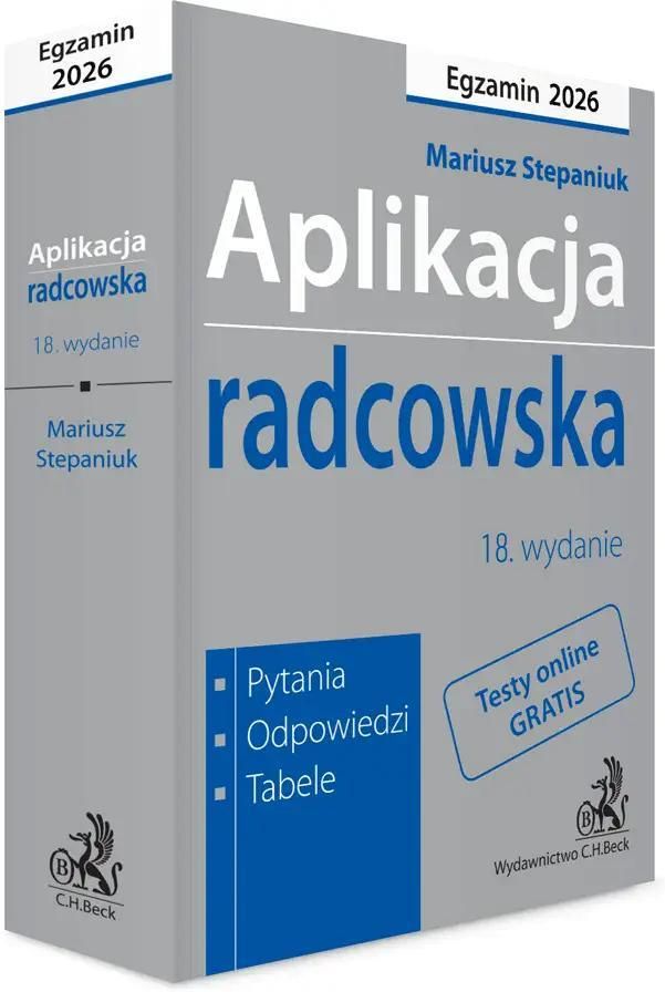 Przygotuj się do egzaminu wstępnego na aplikację radcowską w 2026!Opracowanie w formie wygodnej tabeli zawiera zbiór testów z odpowiedziami, które przede wszystkim ułatwiają naukę do egzaminu wstępnego, a także przypomną i utrwalą zagadnienia potrzebne do wykonywania praktyki zawodowej.Dodatkowo książka zawiera miesięczny dostęp do testów online opracowanych zgodnie z wykazem ustaw wymaganych na egzaminie radcowskim, ogłaszanym corocznie przez Ministra Sprawiedliwości.Zgodnie z wymogami egzaminacyjnymi pytania testowe są jednokrotnego wyboru i każde z nich zawiera trzy odpowiedzi, w tym jedną, prawidłową wraz z podaniem podstawy prawnej. Pytania oparte są jedynie na brzmieniu tekstów ustaw, nie dotyczą problemów doktrynalnych czy zagadnień wynikających z orzecznictwa.Aplikacja radcowska zawiera testy z wszystkich ustaw objętych wykazem publikowanym przez Ministerstwo Sprawiedliwości (brakujące testy z ustaw wymaganych w 2026 r. są publikowane w wersji online).Zbiór uwzględnia stan prawny na styczeń 2026 r. i zmiany, które zostały ogłoszone w Dz.U. do tego czasu, a wchodzące w życie do końca września 2026 r. Zapewniamy kilkakrotną aktualizację pytań do dnia egzaminu w 2026 r. (w tym nowe testy po opublikowaniu wykazu aktów prawnych, które będą obowiązywały na egzaminie w 2026 r.). Sprawdź na stronie aktualizacje.beck.pl.Pytania, które pojawiły się w ubiegłych latach na egzaminach są zaznaczone na szaro.Do książki została dołączona zakładka, która pomaga w nauce. Zakładka zakrywa odpowiedź i podstawę prawną - wystarczy ją przyłożyć pod treścią pytania. EAN: 9788384115534