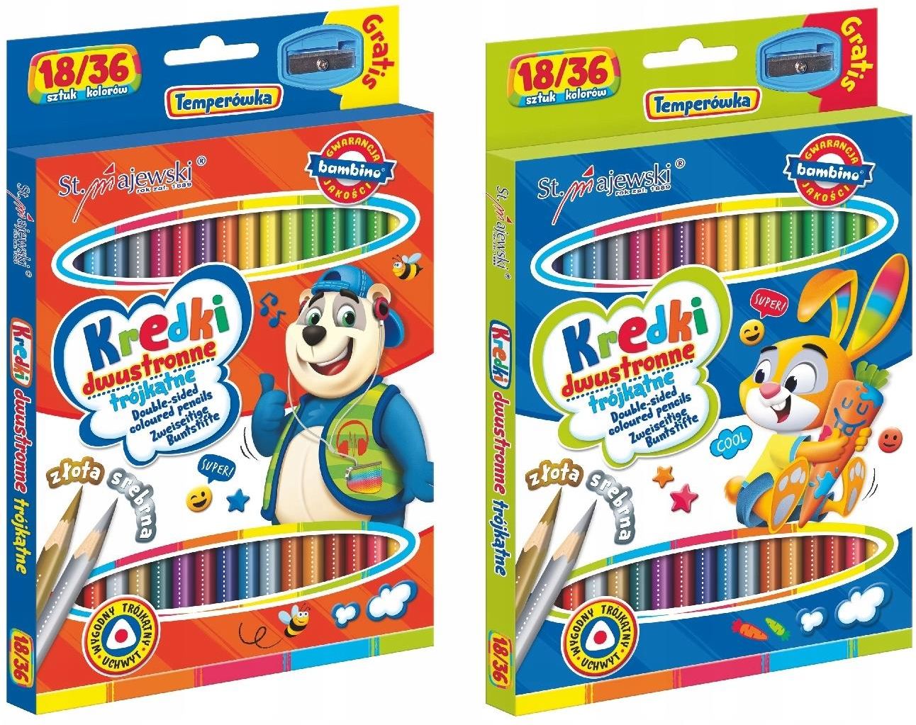 Kredki szkolne trójkątne dwustronne, 18/36 kolorów Cechy produktu: kredki dwustronne o trójkątnym przekroju bogata gama kolorów gwarancja jakości Bambino spełniają wymagania zasadnicze dyrektywy Parlamentu Europejskiego i Rady 2009/48/WE z dnia 18 czerwca 2009 w sprawie bezpieczeństwa zabawek oraz wymogi odpowiednich norm w zestawie kredka złota i srebrna temperówka gratis ilość sztuk w opakowaniu: 18 ilość kolorów: 36 wysokość kredki ok 18cm 18 kredek dwustronnych co daje nam aż 36 kolorów Produkt w różnych wersjach kolorystycznych okładki. Aukcja dotyczy jednego produktu. Produkt wysyłany w zależności od dostępności. (Prosimy o podanie wybranego wzoru w wiadomości do sprzedającego)