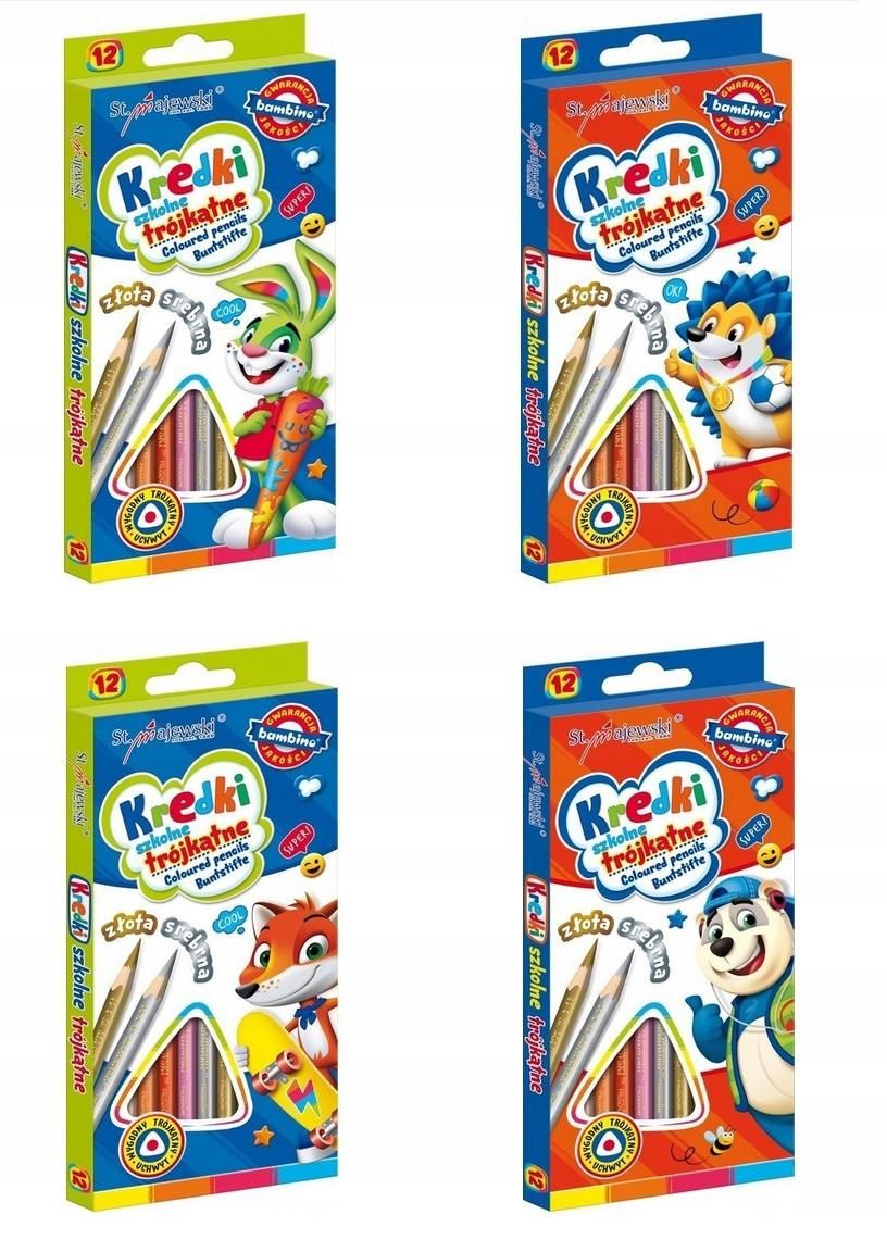 KREDKI BAMBINO OŁÓWKOWE 12KOL 18CM 2038 A"10 ST. MAJEWSKI SP. Z O. O. Kredki szkolne trójkątne, 12 kolorów Cechy produktu: ergonomiczne kredki ołówkowe o trójkątnym przekroju bogata gama kolorów wysoka jakość wykonania gwarancja jakości Bambino spełniają wymagania zasadnicze dyrektywy Parlamentu Europejskiego i Rady 2009/48/WE z dnia 18 czerwca 2009 w sprawie bezpieczeństwa zabawek oraz wymogi odpowiednich norm w zestawie kredka złota i srebrna 12 kolorów Produkt w różnych wersjach kolorystycznych okładki. Aukcja dotyczy jednego produktu. Produkt wysyłany w zależności od dostępności. (Prosimy o podanie wybranego wzoru w wiadomości do sprzedającego) ZAPRASZAMY DO ZAKUPU! Stan: Nowy Marka: Bambino Kod producenta: 02038 Liczba sztuk w zestawie: 12 Rodzaj: ołówkowe Kolor: wielokolorowy Bohater / Bajka: brak Płeć: chłopcy|dziewczynki Waga produktu z opakowaniem jednostkowym: 0.3 EAN: 5903235002038 MAJEWSKI