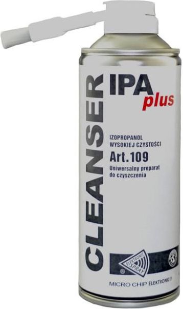 CLEANSER IPA PLUS to innowacyjny produkt - najwyższej czystości alkohol izopropylowy w formie sprayu z pędzelkiem. IPA jest najbardziej wszechstronnym i najczęściej używanym środkiem czyszczącym. Neutralny chemicznie wobec większości materiałów. Powszechnie stosowany w elektronice, elektrotechnice, optyce, przemyśle precyzyjnym. Nie pozostawia śladów, szybko odparowywuje. Spray posiada zawór działający w kilku położeniach, m.in. w odwróconej pozycji. DOZUJESZ JAK CHCESZ: krótką dyszą - szeroki strumień rozpylenia wypuszcza większą ilość alkoholu długą rurką kapilarną - dzięki niej alkohol dociera w trudno dostępne miejsca pędzelkiem - przy jego użyciu od razu czyścisz Jedynie nasz produkt nie powoduje oszronienia czyszczonych elementów. Uwaga na spraye innych firm! Mogą one powodować oszronienie soczewek oraz innych elementów optycznych, co może doprowadzić do ich uszkodzenia. PRZEZNACZONY DO CZYSZCZENIA: precyzyjnych układów elektronicznych telefonów GSM urządzeń optycznych czytników laserowych głowic magnetycznych napędów dyskowych precyzyjnych obwodów drukowanych napędów sprzętu audio-video urządzeń mechaniki precyzyjnej rolek gumowych zmywanie środków smarnych zmywanie tuszów wodoodpornych zmywanie past termoprzewodzących