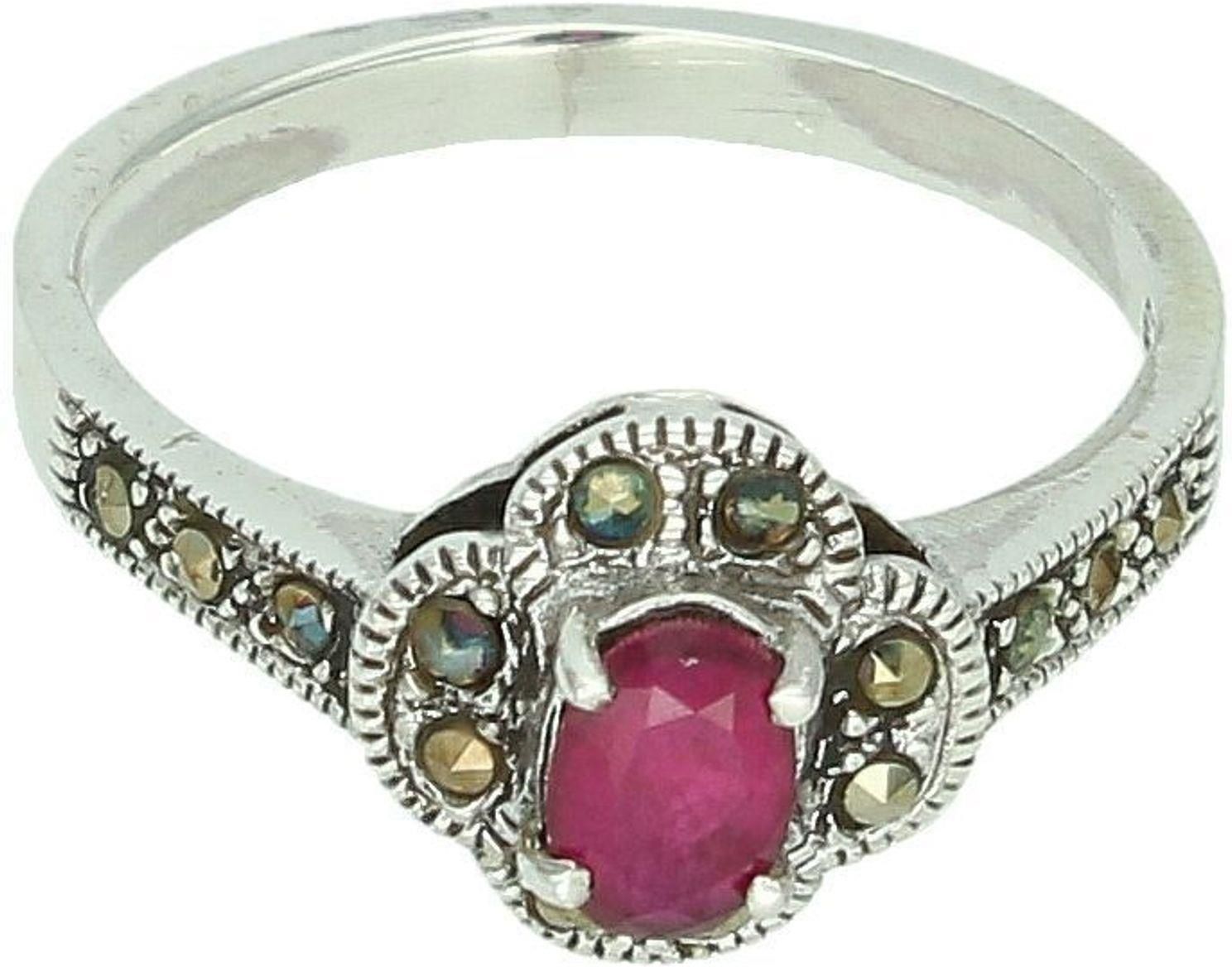 Diament Srebrny pierścionek z rubinem syntetycznym i markazytami w kształcie kwiatka Ag 925 3,36 g Toruń