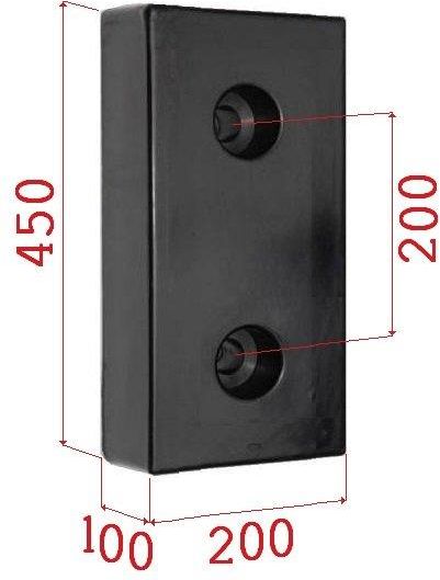 Odboje gumowe do ramp przeładunkowych Szerokość: 200 mm Wysokość: 450 mm Grubość: 100 mm Rozstaw otworów montażowych: 200 mm Otwór na śrubę: Ø22 mm Otwór pod podkładkę: Ø60 mm Wgłębienie na nakrętke: 60 mm Twardość: 62° Shore’a