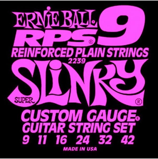 Ernie Ball Slinkys grane są przez legendy na całym świecie, w tym Jimmy Page, Metallica, Eric Clapton, Slash i nie tylko RPS Slinkys mają specjalnie zaprojektowane uzwojenie z drutu mosiężnego, który jest ściśle owinięty wokół lock-Twist Ball Ends Strun Plain (E, B i G) Minimalizuje ślizganie się i łamanie na końcu struny Struny D, A i głęboka E składają się z niklowanego drutu stalowego, który jest owinięty wokół ocynkowanego sześciokątnego rdzenia stalowego Wyprodukowano w USA
