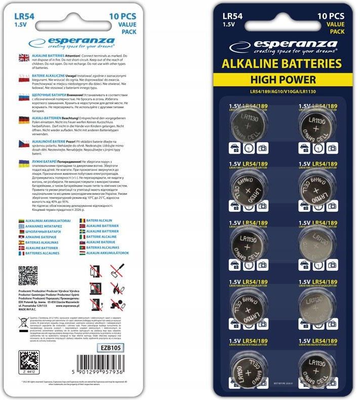 Esperanza Baterie Alkaliczne Lr54 Ag10 10Szt Toruń