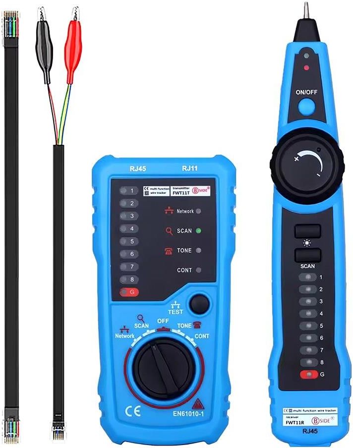 Tester kabli sieciowych i telefonicznych BSIDE FWT11 – niezawodny pomocnik w diagnostyce sieci BSIDE FWT11 to profesjonalny tester do diagnozowania i śledzenia kabli sieciowych oraz telefonicznych. Dzięki swojej wszechstronności i intuicyjnej obsłudze idealnie sprawdzi się zarówno w rękach specjalistów, jak i użytkowników domowych. Urządzenie umożliwia precyzyjne sprawdzenie stanu połączeń, lokalizowanie przewodów oraz testowanie polaryzacji i poziomu linii. Funkcje i cechy Śledzenie przewodów: Szybkie odnajdywanie kabli w wiązkach (RJ11, RJ45, przewody metalowe). Testowanie kabli sieciowych: Diagnostyka zwarć, przerw i błędnych połączeń. Sprawdzanie linii telefonicznej: Identyfikacja stanu pracy (dzwonienie, podniesiona słuchawka) oraz polaryzacji linii TIP/RING. Sprawdzanie ciągłości przewodów: Weryfikacja obwodów w prosty i szybki sposób. Zalety Wyraźne diody LED ułatwiające odczyt wyników testów. Intuicyjny interfejs i łatwa obsługa. Solidna, kompaktowa obudowa idealna do pracy w terenie. Zasilanie bateryjne dla pełnej mobilności: 2x bateria 9V (w zestawie). Obsługiwane złącza: RJ11, RJ45. Funkcje testowe: śledzenie przewodów, testowanie sieci, polaryzacja linii. W zestawie BSIDE FWT11 (nadajnik i odbiornik). Przewody testowe z adapterami RJ11 i RJ45. Instrukcja obsługi. Zastosowania Serwis i diagnostyka sieci komputerowych i telefonicznych. Prace instalacyjne i konserwacyjne. Domowe rozwiązywanie problemów z kablami.