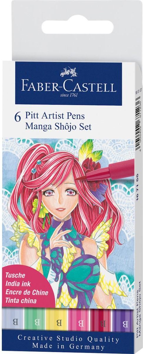 Cechy produktu Zestaw pisaków artystycznych Faber-Castell Pitt Artist Pen Manga Shojo 6 szt. z końcówką B pędzelkową w opakowaniu kartonowym. Zaprojektowane do kolorowania kreskówek i mangi. To połączenie zalet tradycyjnych rysunków wykonywanych tuszem z nowoczesnym, łatwym w użyciu narzędziem. …