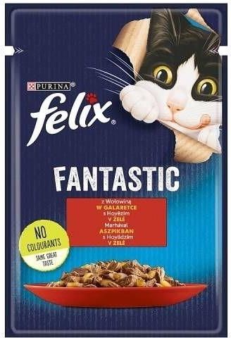 Felix Fantastic Wołowina 85G Opis produktu Pełnoporcjowa karma Fantastic dla dorosłych kotów i odpowiednia także dla kotów wysterylizowanych. Każda receptura, opracowana z wysokiej jakości składników, zawiera delikatne kąski w soczystej galaretce, które Twój kot pokocha! Dania są również źródłem kwasów tłuszczowych omega-6 i zawierają odpowiedni zestaw witamin, aby Twój kot był pełen energii i gotowy do psot! Są pełne wartości odżywczych i zaspokajają 100% dziennego zapotrzebowania Twojego kota przy stosowaniu ich zgodnie z zaleceniami na opakowaniu. Ato nie wszystko! Felix Fantastice oferuje szeroki wybór smaków w pysznych galaretkach, aby każdego dnia zaspokajać uwielbienie Twojego kota dla różnorodności. Naprawdę smakuje tak dobrze jak wygląda! Skład Cukry, Mięso i produkty pochodzenia zwierzęcego 14%, Roślinne ekstrakty białkowe, Ryby i produkty rybne, Składniki mineralne, Wołowina 4% Zalecenia żywieniowe Przeciętnemu dorosłemu kotu, ważącemu ok. 4 kg, zaleca się podawanie 4 saszetek w ciągu dnia, w co najmniej 2 oddzielnych posiłkach. Podane normy ilości karmy dla kotów dorosłych odnoszą się do zwierząt umiarkowanie aktywnych w normalnej temperaturze otoczenia. Indywidualne potrzeby różnią się, a ilość podawanej karmy powinna zostać dostosowana tak, aby utrzymać prawidłową, szczupłą sylwetkę Twojego kota. Podawać w temperaturze pokojowej. Zwierzę powinno mieć stały dostęp do czystej, świeżej wody do picia. Przeciętnemu dorosłemu wysterylizowanemu kotu, ważącemu ok. 4 kg, zaleca się podawanie 3 saszetek w ciągu dnia, w co najmniej 2 oddzielnych posiłkach. Znalezione na unizoo.pl O marce Felix FELIX® to gama pysznych posiłków, które spełnią wysokie wymagania sprytnych kotów. Dania te wyglądają, pachną i smakują tak wyśmienicie jak jedzenie, które mógłbyś przygotować sam! Każda receptura, opracowana z wysokiej jakości składników zawiera delikatne kąski w soczystych galaretkach lub aromatycznych sosach, które Twój kot pokocha! Posiłki są też źródłem kwasów tłuszczowych Omega-6 i zawierają odpowiedni zestaw witamin, aby Twój kot był pełen energii i gotowy do psot! Pełne wartości odżywczych, w 100% spełniają dzienne potrzeby Twojego kota, jeżeli są podawane zgodnie z zaleceniami na opakowaniu. A to nie wszystko! FELIX® to produkty dostępne w szerokiej gamie smaków, aby każdego dnia zaspokajać uwielbienie Twojego kota dla różnorodności. Naprawdę smakuje tak dobrze jak wygląda! FELIX® - nieodparta przyjemność dla Twojego kota!