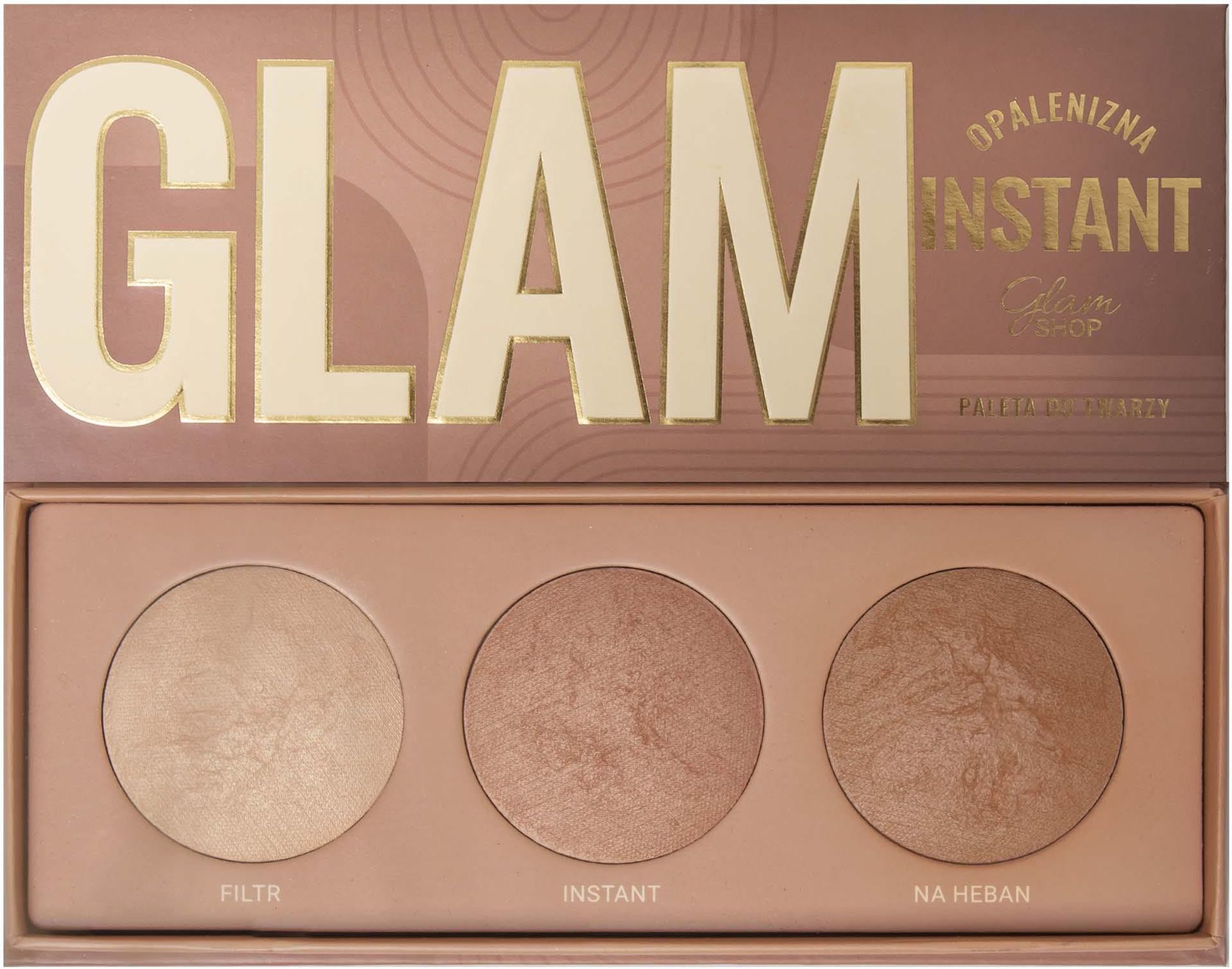 Paleta do makijażu twarzy marki Glam SHOP. Jest w 100% wegańska. Składa się z trzech wypiekanych produktów: dwóch bronzerów o ciepłej i neutralnej tonacji oraz jednego delikatnego "dziennego" rozświetlacza. Kosmetyki posiadają bardzo dobrą pigmentację, dzięki czemu już niewielka ilość potrafi pozostawić na skórze kuszące efekty. Glam Shop paleta skutecznie wymodeluje i wykonturuje kształt twarzy, a także pozostawi na powierzchni skóry efekt kuszącego rozświetlenia. W swojej formule zawierają specjalne perłowe pigmenty, które pięknie odbijają słońce i światło. Doskonale sprawdzą się zarówno podczas codziennego, jak i wieczorowego makijażu. Paleta Glam Shop dostępna jest w solidnym opakowaniu o pojemności 3 x 4g (12 g).Paleta do twarzy. Zawiera bronzery i rozświetlacz. Ma bardzo dobrą pigmentację. Pięknie podkreśla makijaż twarzy. POSZCZEGÓLNE ODCIENIE:- Filtr - złoto-beżowy, - Instant - średni karmelowy brąz z dodatkiem złota, - Na Heban - ciepły opalony brąz z dodatkiem złota.