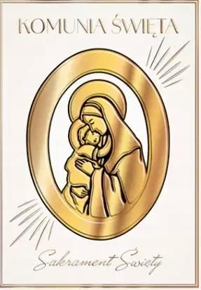 Karnet B6 komunijny, Maryjka Karnet wydrukowany jest na wysokiej jakości papierze formatu B6. Karnet uszlachetniony złotem i tłoczeniem. W zestawie koperta.Wymiary: 24.0 x 16.2 cm Karnet wydrukowany jest na wysokiej jakości papierze formatu B6. Karnet uszlachetniony złotem i tłoczeniem. W zestawie koperta.Wymiary: 24.0 x 16.2 cm
