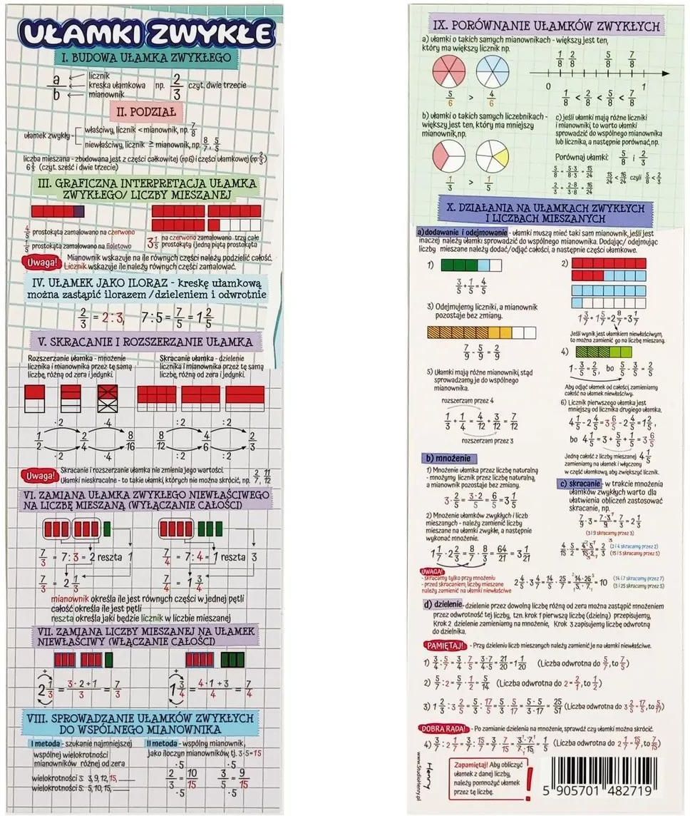 Zakładka Edu-ściąga "Ułamki zwykłe" Henry Dwustronna zakładka edukacyjna dostarczająca kluczowych informacji na temat ułamków zwykłych, jest idealnym wsparciem dla ucznia. Produkt jest pokryty folią, co gwarantuje jego trwałość i odporność na uszkodzenia. Co zawiera zakładka? Zakładka zawiera kompleksowe informacje dotyczące ułamków zwykłych, które są nieodzowną częścią programów matematycznych. Znajdziesz tutaj wyczerpujące wyjaśnienia oraz praktyczne przykłady, dzięki którym zrozumienie tego zagadnienia stanie się prostsze. Dlaczego warto ją mieć? Ta zakładka nie tylko pomoże w przyswojeniu wiedzy, ale także ułatwi powtórki przed sprawdzianami. Jej kompaktowy rozmiar sprawia, że jest łatwa do przenoszenia i zawsze pod ręką, gdy potrzebujesz szybkiej przypomnienia. Z "Edu-ściągą" od Henry, nauka staje się znacznie bardziej przystępna i mniej stresująca. EAN: 5905701482719