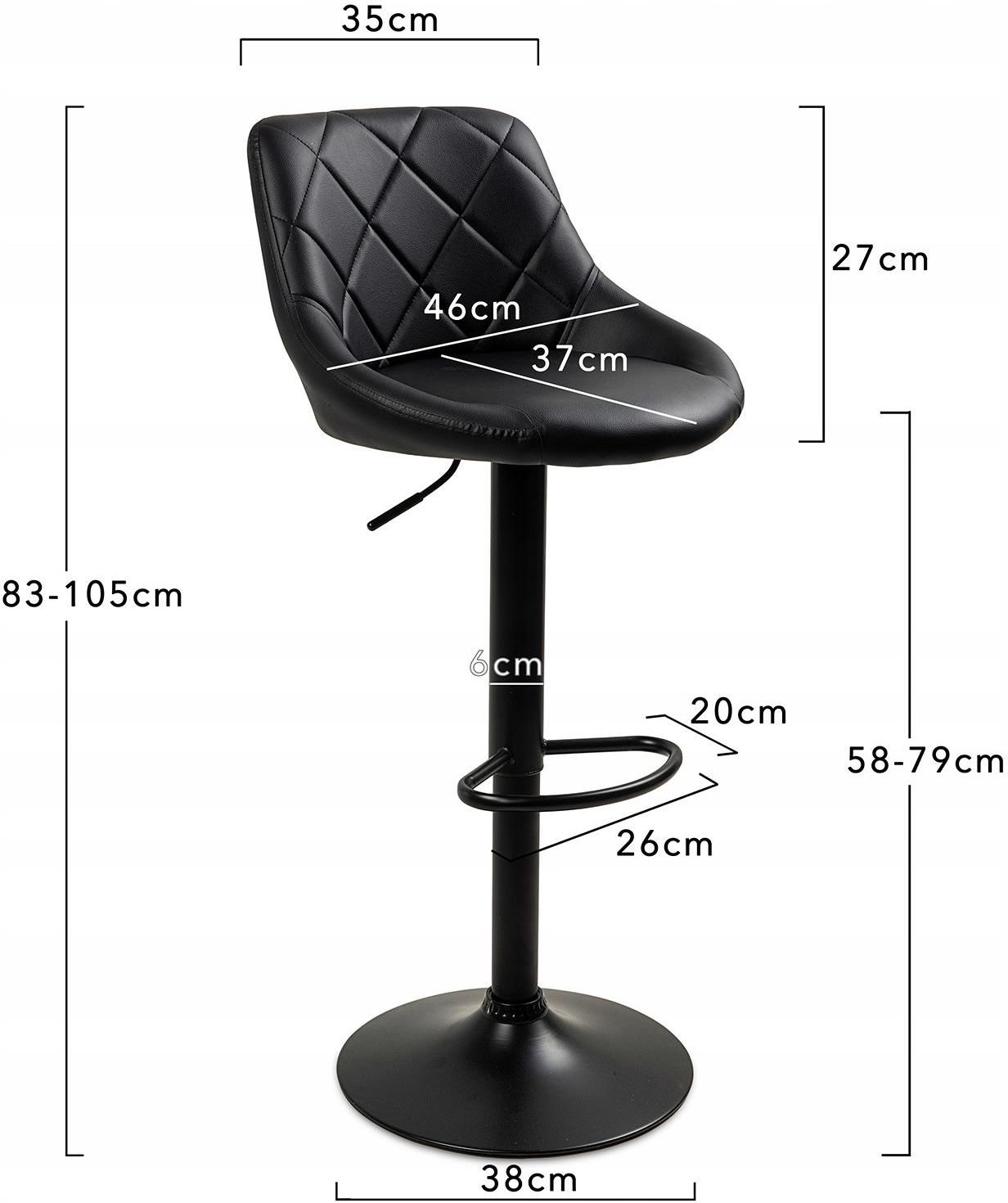 Hoker barowy, kuchenny obrotowy z podnóżkiem, Krzesło Czarne Specyfikacja: Przeznaczenie: Hoker Rodzaj siedziska: Kubełkowe Regulowana wysokość Zasięg obrotu: 360° Stabilna, solidna podstawa Wygodny podnóżek Maksymalny udźwig: 120kg Materiał wykonania: Ekoskóra, metal, tworzywo sztuczne Kolor: Czarny Wysokość max z oparciem: 105cm Wysokość min z oparciem: 83cm Wysokość max siedzisko: 80cm Wysokość min siedzisko: 58cm Wysokość max podnóżka: 42cm Wysokość min podnóżka: 20cm Wymiary oparcia: 35-43x27cm Powierzchnia siedziska: 37x33cm Grubość siedziska: 4,5cm Grubość oparcia: 4,5cm Średnica podstawy: 38cm Średnica rury: 5cm Kształt podstawy: Okrągła Wymiary podnóżka: 26x20x1,5cm Waga: 6,1kg Tolerancja błędu w wymiarach: +/- 5% Zalety hokera: Płynnie regulowana wysokość Solidna, metalowa, antypoślizgowa podstawa Wbudowany podnóżek zapewnia wygodę i stabilność podczas siedzenia Wygodne oparcie Komfort i ergonomia użytkowania Ciekawe geometryczne przeszycia na oparciu Różnorodne zastosowanie Ten model pasuje idealnie do wyższych blatów kuchennych czy stołów barowych Loftowy wzór wpisze się w różnorodne aranżacje wnętrz Przeznaczony do kuchni, jadalni czy salonu Wysoki hoker będzie pasował zarówno do domowego barku jak i kuchennego blatu Zasięg obrotu 360° Miękka ekoskóra Materiał łatwy w utrzymaniu czystości Produkt do samodzielnego montażu Łatwy i szybki montaż