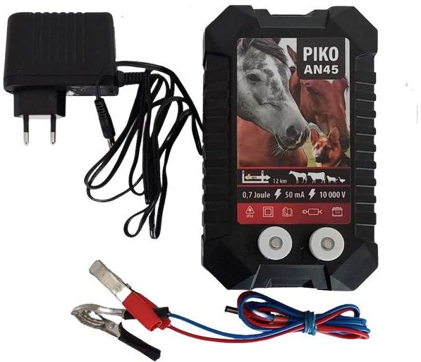 ELEKTRYZATOR AKUMULATOROWO - SIECIOWY PIKO AN45 PIKO AN45 to elektryzator, odpowiedni do ogrodzeń średniej długości. Przeznaczony do ogrodzeń od 1km do 12km (w zależności od obciążenia linii) Energia wejściowa 0,7J Energia wyjściowa 0,45J Zasilanie 12/230V, w komplecie z zasilaczem Pobór prądu 50mA Max. napięcie w Voltach 10.000V WZMOCNIONA PANCERNA OBUDOWA, ODPORNA NA NIEKORZYTNE WARUNKI ATMOSFERYCZNE PRODUKT POLSKI