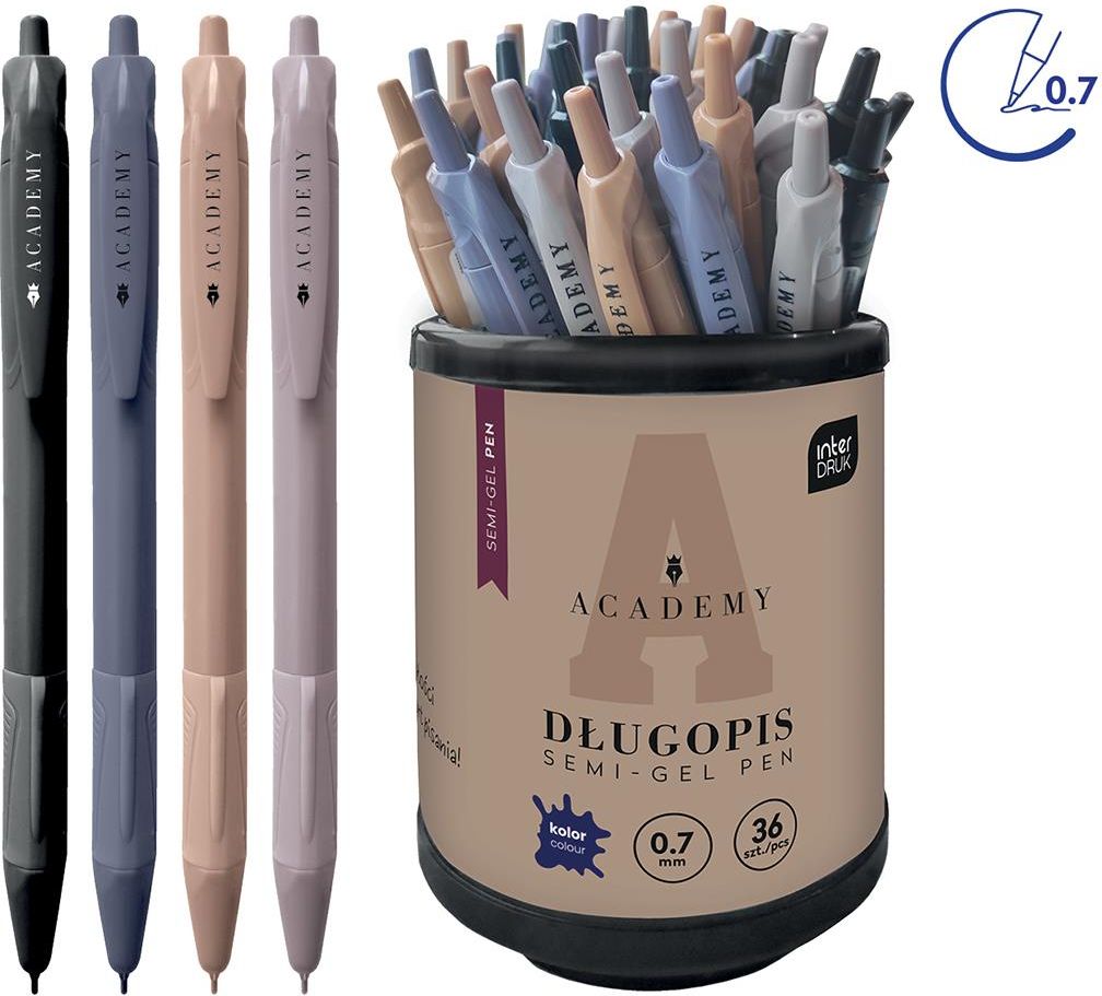 12x Długopis automatyczny Interdruk Academy, mix wzorów Interdruk Długopis automatyczny z niebieskim wkładem. Wygodny gumowy uchwyt. Wkład żelowo-olejowy. Grubość linii pisania 0,7mm. Produkt występuje w kilku wersjach kolorystycznych- wysyłany w zależności od aktualnych stanów magazynowych. Skład …