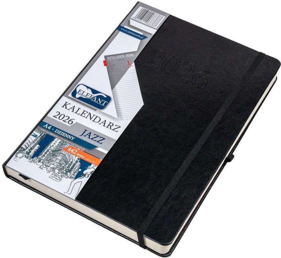 Jazz Kalendarz A4 tygodniowy czarny 2026 • Jazz: kalendarz książkowy 2026 • format: A4• oprawa: twarda wykonana z wysokiej jakości materiału imitującego skórę• kolor: czarny• zamykany na gumkę w kolorze czarny• gumka na długopis w kolorze czarny• zaokrąglone narożniki opraw i stron• dwie tasiemki w …