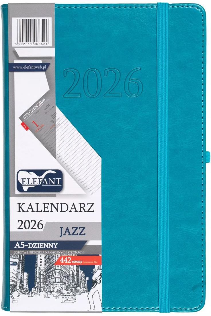 Kalendarz 2026 A5 dzienny Jazz - turkusowy Producent: Elefant Ilość stron: 442 Format: 21.0 x 14.0 x 32.0 cm Oprawa: Twarda EAN: 5902311068524 Cechy produktu Jazz: kalendarz książkowy 2026 format: A5 oprawa: twarda wykonana z wysokiej jakości materiału imitującego skórę kolor: turkusowy oprawa przeszyta delikatną nicią w kolorze turkusowym zamykany na gumkę w kolorze turkusowym gumka na długopis w kolorze turkusowym zaokrąglone narożniki opraw i stron dwie tasiemki w kolorze turkusowym pierwsze strony wewnątrz wraz z kopertą na tylnej oprawie w kolorze kremowym układ: dzienny (sobota i niedziela na oddzielnej stronie) liczba stron: 442 strony gramatura papieru: 80 g/m2 papier w kolorze delikatnym chamois wymiary: długość 210 mm, szerokość 140 mm, wysokość 32 mm oprawa przygotowana do personalizacji kalendarza np. logo firmy, imię i nazwisko itp. Kalendarz wewnątrz zamiera plan roku i rozkład roku 2026, specjalny planer do zarządzania zadaniami w czasie(np. planowanie urlopów, wakacji, wizyt klientów, zabiegów itp.) z podziałem na każdy miesiąc osobno, terminy ferii zimowych, święta oficjalne i zwyczajowe, podróże, informacje dla podróżnych, protokół powypadkowy w przypadku stłuczki, notes, skorowidz teleadresowy, kalendarium dodatkowe na 2025-2026-2027 rok