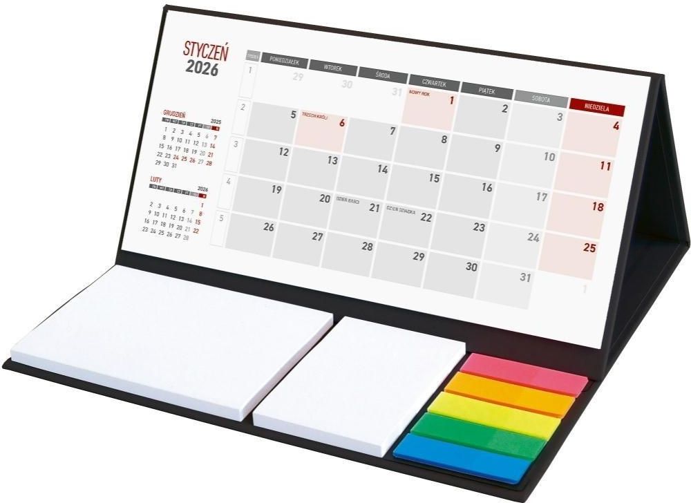 Kalendarz 2026 na biurko miesięczny WOKÓŁ NAS z notesem i zakładkami kol. czarny [KB064B] Funkcjonalny kalendarz biurkowy w układzie trzymiesięcznym, łączący przejrzyste kalendarium z praktycznymi samoprzylepnymi karteczkami i znacznikami. Umożliwia jednoczesny podgląd miesiąca bieżącego, poprzedniego i następnego, a zaznaczone święta ułatwiają planowanie. Wykonany z białego papieru o gramaturze 70 g/m², z drukiem w eleganckiej kolorystyce szaro-bordowej. Kalendarium w języku polskim ma wymiary 204 x 99 mm, natomiast format całego kalendarza wynosi 210 x 192 x 112 mm. Składa się z 12 kart, po jednej na każdy miesiąc. Na tylnej części podstawki przewidziano pole reklamowe o wymiarach 210 x 110 mm, które może być zadrukowane lub pokryte naklejką, co pozwala na personalizację produktu. Kalendarz pakowany jest pojedynczo w folię. typ: kalendarz biurkowy z notesem i znacznikami układ: trzymiesięczny język kalendarium: PL papier: biały 70 g/m² kolor: czarny druk: szaro-bordowy format kalendarium: 204 x 99 mm format całkowity: 210 x 192 x 112 mm liczba kart: 12 pole reklamowe: 210 x 110 mm (tył podstawki) dodatki: notesy samoprzylepne, znaczniki brak stopki wydawniczej Dodatkowo w zestawie znajdują się: samoprzylepne notesy 50 kartek (100 x 72 mm), samoprzylepne notesy 50 kartek (50 x 72 mm), samoprzylepne znaczniki.