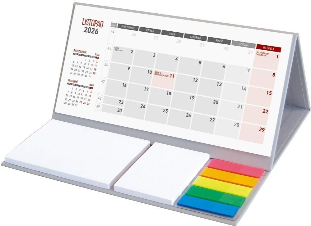 Kalendarz 2026 na biurko miesięczny WOKÓŁ NAS z notesem i zakładkami kol. szary [KB064B] Funkcjonalny kalendarz biurkowy w układzie trzymiesięcznym, łączący przejrzyste kalendarium z praktycznymi samoprzylepnymi karteczkami i znacznikami. Umożliwia jednoczesny podgląd miesiąca bieżącego, poprzedniego i następnego, a zaznaczone święta ułatwiają planowanie. Wykonany z białego papieru o gramaturze 70 g/m², z drukiem w eleganckiej kolorystyce szaro-bordowej. Kalendarium w języku polskim ma wymiary 204 x 99 mm, natomiast format całego kalendarza wynosi 210 x 192 x 112 mm. Składa się z 12 kart, po jednej na każdy miesiąc. Na tylnej części podstawki przewidziano pole reklamowe o wymiarach 210 x 110 mm, które może być zadrukowane lub pokryte naklejką, co pozwala na personalizację produktu. Kalendarz pakowany jest pojedynczo w folię. typ: kalendarz biurkowy z notesem i znacznikami układ: trzymiesięczny język kalendarium: PL papier: biały 70 g/m² kolor: szary druk: szaro-bordowy format kalendarium: 204 x 99 mm format całkowity: 210 x 192 x 112 mm liczba kart: 12 pole reklamowe: 210 x 110 mm (tył podstawki) dodatki: notesy samoprzylepne, znaczniki brak stopki wydawniczej Dodatkowo w zestawie znajdują się: samoprzylepne notesy 50 kartek (100 x 72 mm), samoprzylepne notesy 50 kartek (50 x 72 mm), samoprzylepne znaczniki.