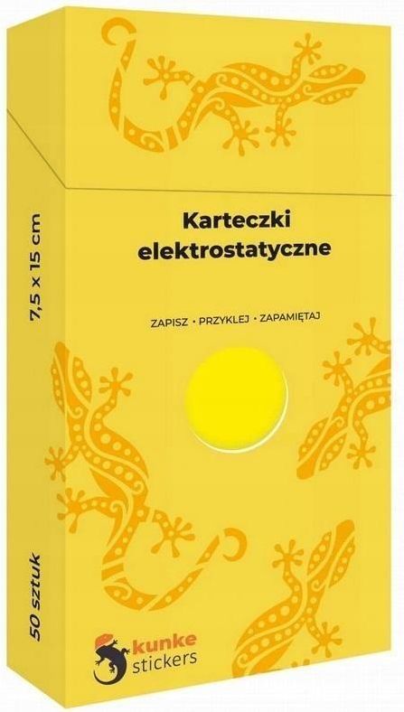 Karteczki Elektrostatyczne Żółte Karteczki elektrostatyczne - to naelektryzowana folia na podkładce papierowej, 50 kartek w pudełku (7,5 x 15 cm). Po zdjęciu z podkładu przyklejają się do wszystkich suchych powierzchni bez użycia kleju. Można je przesuwać, nie pozostawiają śladów, przyklejają się również "twarzą do szyby" Spełniają tą samą funkcję co tradycyjne karteczki z klejem (stick notes), jednak są wygodniejsze w stosowaniu. Oprócz robienia notatek służą do pracy zespołowej np. "burzy mózgów" czy pracy nad projektami. Na folii można pisać flamastrem permanentnym lub długopisem, do zapisków można również wykorzystać papierową podkładkę. Zapisz Przyklej Zapamiętaj Są niezbędne: w domu i biurze - usprawnia komunikacje, w edukacji - do nauki słówek, wzorów i dat, do pracy nad projektami: Canvas, Design Thinking, Scram, Kanban, Brainstorm (burza mózgów), Metaplan itp. Karteczki elektrostatyczne są bezpieczne dla środowiska ponieważ folia polipropylenowa oraz papierowe podkładki, z których są wykonane, podlegają recyklingowi.