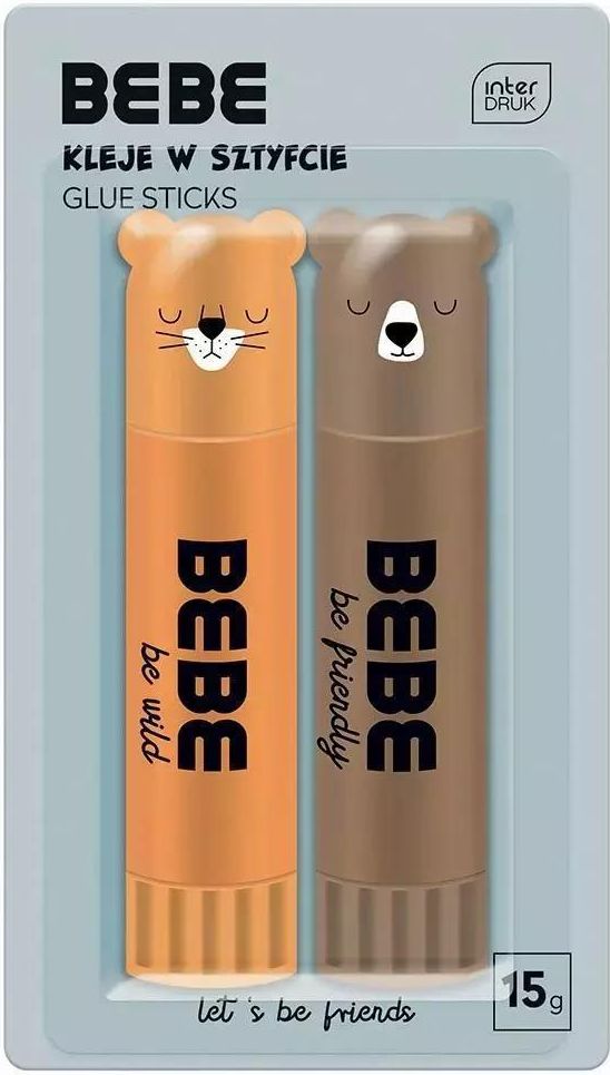 KLEJ W SZTYFCIE 2 SZTUKI BB FRIEND BOY 15G Zestaw 2 klejów w sztyfcie o wydajnej pojemności 15 g. Łatwo zmywalne i przezroczyste po wyschnięciu. Zabawne, "uszkowe" nasadki z podobiznami zwierzaków z kolekcji BEBE Friends.