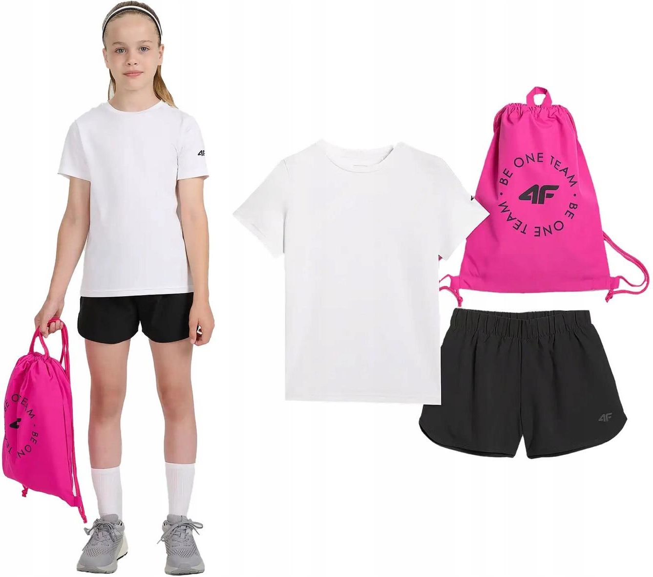Zestaw na wf dla dziewczynki 4F obejmujący koszulkę, spodenki i worek na buty to jeden z podstawowych elementów szkolnej wyprawki. Komplet tworzy funkcjonalny stój na zajęcia sportowe w szkole. Koszulkę z okrągłym dekoltem z lekkim ribowaniem uszyto z szybkoschnącej tkaniny. Włókna w technologii 4FDry pomagają na bieżąco odprowadzać wilgoć. Regularny krój koszulki z obniżoną linią ramion swobodnie układa się na sylwetce zapewniając nieograniczony zakres ruchów. Spodenki posiadają standardowy krój z krótkimi nogawkami, który wygodnie dopasowuje się do sylwetki. Elastyczny pas bez regulacji stabilnie układa się na sylwetce. Spodenki uszyto z szybkoschnącej tkaniny. Włókna w technologii 4FDry pomagają na bieżąco odprowadzać wilgoć. Komplet sportowy i obuwie treningowe można spakować do worka na buty który, dzięki zastosowaniu specjalnych szelek ze sznurka może posłużyć również jako plecak na krótką wycieczkę. Zestaw na wf to praktyczne rozwiązanie, dzięki któremu zaoszczędzisz czas i pieniądze. Materiał główny: 94% poliester, 6% elastanMateriał główny 2: 93% bawełna, 7% elastanMateriał główny 3: 100% poliester Koszulka:· Gramatura: 180 gsm· Regularny krój wygodnie dopasowuje się do sylwetki· Wykonana z materiału syntetycznego, który zapewnia trwałość i jest łatwy w pielęgnacji· Dodatek elastanu sprawia, że materiał jest elastyczny i wygodnie układa się na sylwetce· Jednolita kolorystyka pasująca do wielu stylizacji· Miękka w dotyku dzianina single jersey o gładkiej powierzchni· Okrągły dekolt z lekkim ribowaniem· Obniżona linia ramion· Szybkoschnące włókna w technologii 4FDry odprowadzają wilgoć Spodenki:· Standardowy krój wygodnie dopasowuje się do sylwetki· Krótki krój· Wykonane z materiału syntetycznego, który zapewnia trwałość i jest łatwy w pielęgnacji· Rozciągliwy materiał dzięki dodatkowi elastanu· Jednolita kolorystyka pasująca do wielu stylizacji· Miękka w dotyku dzianina single jersey o gładkiej powierzchni· Pas bez regulacji· Szybkoschnące włókna w technologii 4FDry odprowadzają wilgoć Plecak-worek· Zakres rozmiarów: uniwersalny (one-size)· Wykonany z materiału syntetycznego, który zapewnia trwałość i jest łatwy w pielęgnacji· Szelki pełniące funkcję ściągacza· Uchwyt do zawieszenia na wieszaku