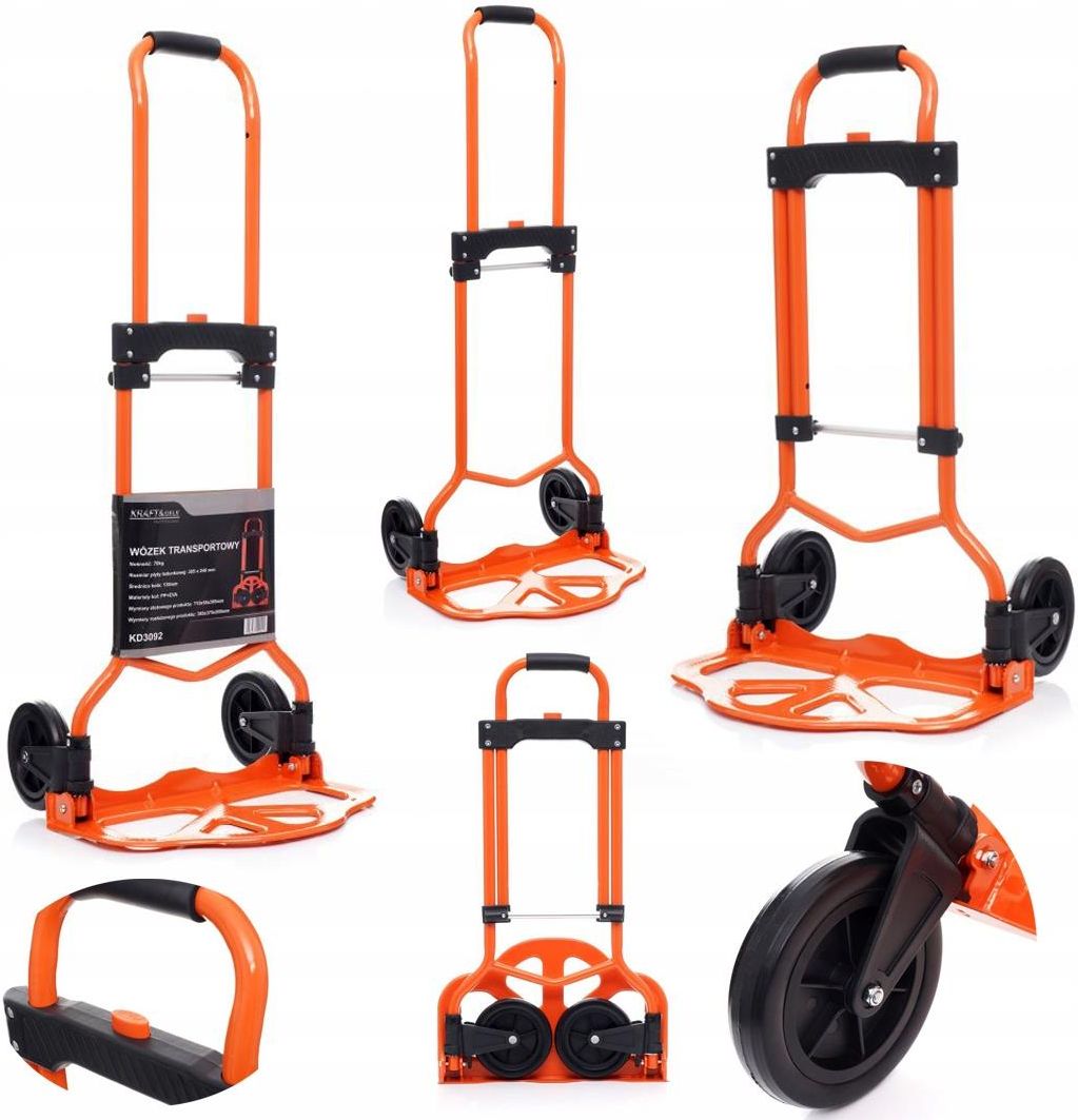 Wózek Transportowy Magazynowy Składany Aluminium 70kg Ładowność do 70 KG – wózek transportowy Kraft&Dele ma maksymalną nośność 70 kg, co oznacza, że można poruszać dużą liczbę ciężkich kartonów i innych towarów bez nadmiernego obciążania ciała. Składany – jeśli nie używasz wózka, naciśnij uchwyt w dół i złożyć platformę. Po złożeniu wózek można łatwo schować w szafie, bagażniku lub na ścianie. Mocny materiał – wózek transportowy jest wykonany ze stabilnego aluminium. Dzięki temu jest on trwały i nie pęka podczas transportu ciężkich towarów. Zastosowanie – dzięki dużej pojemności wózek transportowy Kraft&Dele nadaje się zarówno do celów prywatnych, jak i biznesowych. Na przykład podczas przeprowadzki skrzynek lub transportu towarów w magazynie. Wielofunkcyjność – oprócz transportu kartonów i innych ciężkich przedmiotów można używać wózków transportowych do wielu innych celów. Pomyśl podczas transportu żywności lub ciężkiego bagażu podczas urlopu. Mobilny, poręczny wózek transportowy marki Kraft&Dele model KD3092 to niezastąpiony przedmiot podczas transportu ciężkich towarów. Dużą zaletą Naszego wózka jest to że z łatwością zabierzemy go w każde miejsce, dzięki funkcji składania zajmuję bardzo mało miejsca. Po złożeniu jego wymiar to tylko 71 x 38,5 x 5,5 cm. Wykonany z wysokiej jakości aluminium. Wyposażony w gumowe koła, które zapewniają stabilną jazdę oraz wysoką przyczepność do różnych powierzchni. Platforma została wzmocniona dodatkowymi podporami, które wzmacniają jej strukturę. Łatwy montaż i złożenie przed podniesieniem głównego uchwytu, należy odłożyć podkładkę do przodu i od wózka. Podobnie przesuń uchwyt z powrotem w dół i złóż stopkę w górę, a otrzymasz smukłą, kompaktową jednostkę, idealną do przechowywania w szopie, szafce lub bagażniku samochodu. Rozmiar po rozłożeniu: 710 x 55 x 385 mm Solidna konstrukcja i konstrukcja Dzięki dwóm gumowym kółkom 150 mm bez przebicia, worek nadaje się zarówno do użytku wewnątrz, jak i na zewnątrz – i może być używany do pchania lub ciągnięcia dużego ładunku, a nie do przenoszenia. Teleskopowa konstrukcja pozwala dostosować wysokość uchwytu do własnych preferencji, a zakrzywiony stalowy uchwyt zapewnia wygodne trzymanie. Co więcej, dwa dodatkowe wzmocnione pręty i dwa dodatkowe podpory / uchwyty z tyłu zapewniają dodatkową stabilność podczas ruchu wózka Składana konstrukcja stopki oznacza, że gdy nie jest używana, worek przekształca się w smukłą jednostkę, która z łatwością zmieści się w skromnym miejscu do przechowywania, więc nie doda bałaganu do domu ani nie zajmie cennego przechowywania w bagażniku samochodu. Wytrzymała konstrukcja zapewnia łatwy transport ciężkich ładunków. Wysokiej jakości materiały zapewniają stabilną ramę . Łatwa i szybka obsługa mechanizmu składania do użytku lub do przechowywania wózka transportowego, oszczędzając miejsce. Bezpieczny uchwyt teleskopowy obsługiwany za pomocą jednego przycisku. Ergonomicznie ukształtowany uchwyt zapewnia wygodne i bezpieczne trzymanie podczas transportu. Antypoślizgowa powierzchnia ładunkowa zapewnia dodatkową stabilność oraz napinacz bagażu jest przymocowany do wózka. Wysokiej jakości gumowe kółka nadają się do lekkiego i cichego toczenia oraz dużej nośności, która spełnia wymagania. Dzięki nośności 90 kg wózek ręczny staje się codziennym wszechstronnym wózkiem, który jest szybko pod ręką. SPECYFIKACJA TECHNICZNA Maksymalne obciążenie: 70 kg Średnica kółek: 13 cm Rozmiar platformy: 385 x 240 mm Rozmiar po rozłożeniu: 385 x 375 x 950 mm Rozmiar po złożeniu: 710 x 55 x 385 mm Waga: ok. 3,25 kg