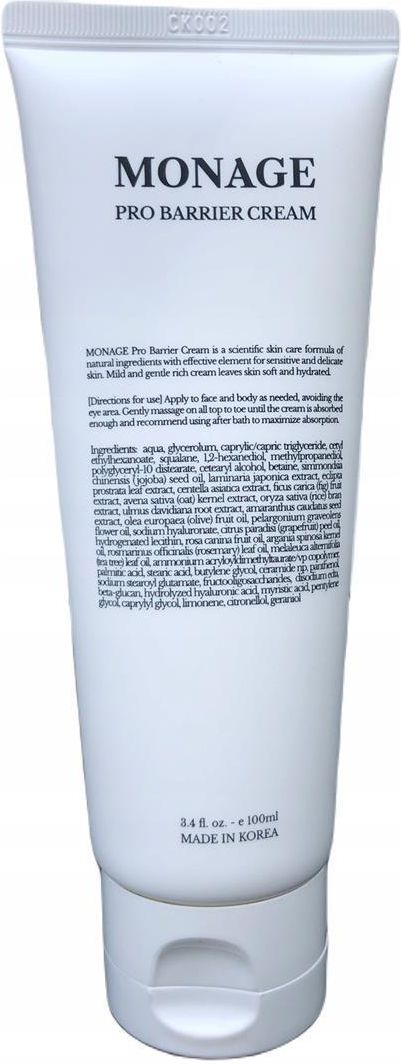 ORYGINALNY PRODUKT MADE IN KOREA MONAGE Pro Barrier Cream Ochronny krem do twarzy, silnie nawilżający 100ml MONAGE Pro Barrier Cream to wegański, wysokoskoncentrowany krem, który zapewnia natychmiastową i głęboką pielęgnację oraz ochronę skóry. Bogaty w ekstrakty roślinne i naturalne oleje, krem dostarcza długotrwałego nawilżenia, tworząc jedwabistą warstwę na skórze. Pozostawia skórę nawilżoną, odżywioną i zdrową. Może być stosowany jako krem i maść, idealny do pielęgnacji podrażnionych i wyjątkowo suchych miejsc. MONAGE Pro Barrier Cream pełni podwójną funkcję – nawilżającego kremu oraz łagodzącej maści. Dzięki zawartości skwalanu, pięciu olejków roślinnych oraz beta-glukanu, krem skutecznie chroni barierę skórną i utrzymuje ją zdrową oraz nawilżoną przez cały dzień. Jego naturalny skład sprawia, że jest bezpieczny do stosowania przez noworodki, osoby z wrażliwą oraz atopową cerą. Najważniejsze składniki i ich właściwości Skwalan: Naturalny emolient, który nawilża i chroni skórę przed utratą wilgoci, nadając jej miękkość i elastyczność. Beta-glukan: Posiada właściwości łagodzące i przeciwzapalne, wspomaga regenerację skóry i wzmacnia jej barierę ochronną. Oleje roślinne (jojoba, oliwa z oliwek, róża dzika, arganowy, olejek z drzewa herbacianego): Intensywnie nawilżają, odżywiają i regenerują skórę, jednocześnie chroniąc ją przed działaniem czynników zewnętrznych. Najważniejsze cechy produktu Wegański i bezpieczny skład: Krem stworzony jest z naturalnych składników, co czyni go odpowiednim do stosowania przez noworodki, osoby z wrażliwą oraz atopową cerą. Głębokie nawilżenie: Zawartość skwalanu oraz olejków roślinnych zapewnia długotrwałe nawilżenie i odżywienie skóry, pozostawiając ją jedwabiście gładką. Wsparcie dla podrażnionej skóry: Dzięki właściwościom łagodzącym beta-glukanu oraz ekstraktów roślinnych, krem doskonale nadaje się do pielęgnacji podrażnionych i suchych miejsc. Ochrona i regeneracja: Składniki aktywne, takie jak ceramidy i witamina B5 (dexpanthenol), wzmacniają barierę ochronną skóry i wspomagają jej regenerację, zapewniając zdrowy wygląd na co dzień. Sposób użycia: Stosuj jako ostatni krok w pielęgnacji. Po oczyszczeniu i tonizowaniu skóry, nałóż odpowiednią ilość kremu na twarz i delikatnie wmasuj.