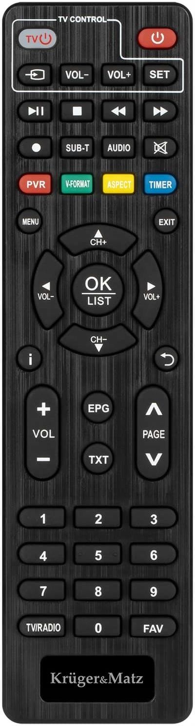 Pilot do dekodera DVB-T2 marki Kruger&Matz KM9999 Pilot Kruger&Matz kompatybilny z modelami KM0550 / KM0550A / KM0550B / KM0550C / KM9999 Wyposażony w 4 programowalne przyciski. Dzięki temu użytkownik ma możliwość zaprogramowania jednego pilota do obsługi zarówno dekodera, jak i telewizora, co znacznie ułatwia korzystanie z obydwu urządzeń. Do pełnej obsługi wystarczy tylko jeden pilot. Główne cechy Możliwość programowania przycisków Zasięg działania: ok. 10m Zasilanie: 2xAAA Działa od razu po wyjęcia z opakowania Nie wymaga programowania. Obsługuje dekodery Kruger&Matz KM0550 KM0550A KM0550B KM0550C KM9999 Kopiowanie przycisków z pilota telewizora Pilot posiada możliwość zaprogramowania 4 przycisków: TV/AV, VOL-,VOL+,POWER. W celu zaprogramowania przycisków należy: Przytrzymać przycisk „SET” przez 3 sekundy, aż czerwona lampka znajdująca się w przycisku power, zaświeci się światłem ciągłym. Krótko nacisnąć przycisk, który ma być programowany, czerwona lampka zacznie migać. Nakierować piloty na siebie i wcisnąć przycisk którego funkcja ma być skopiowana do pilota. Lampka na pilocie zamiga, następnie zaświeci się światłem ciągłym. Znaczy to, że pilot przyjął funkcję i jest gotowy do programowania następnych przycisków. W celu zaprogramowania następnego przycisku, należy powtórzyć operację od punktu numer 2. W celu zakończenia programowania przycisków pilota należy nacisnąć przycisk „SET”, lampka zgaśnie a pilot przełączy się z trybu nauki do trybu pracy normalnej. PILKM9999
