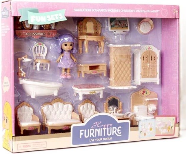 Laleczka z akcesoriami 7228926 26087 Laleczka z akcesoriami 7228926 26087 Laleczka z akcesoriami 7228926 26087 Na zdjęciu widzimy zestaw zabawkowy Happy Furniture z serii Fun Sets, który pozwala dzieciom na zabawę w aranżowanie wnętrz i odgrywanie różnych scenariuszy. Zestaw zawiera miniaturowe …