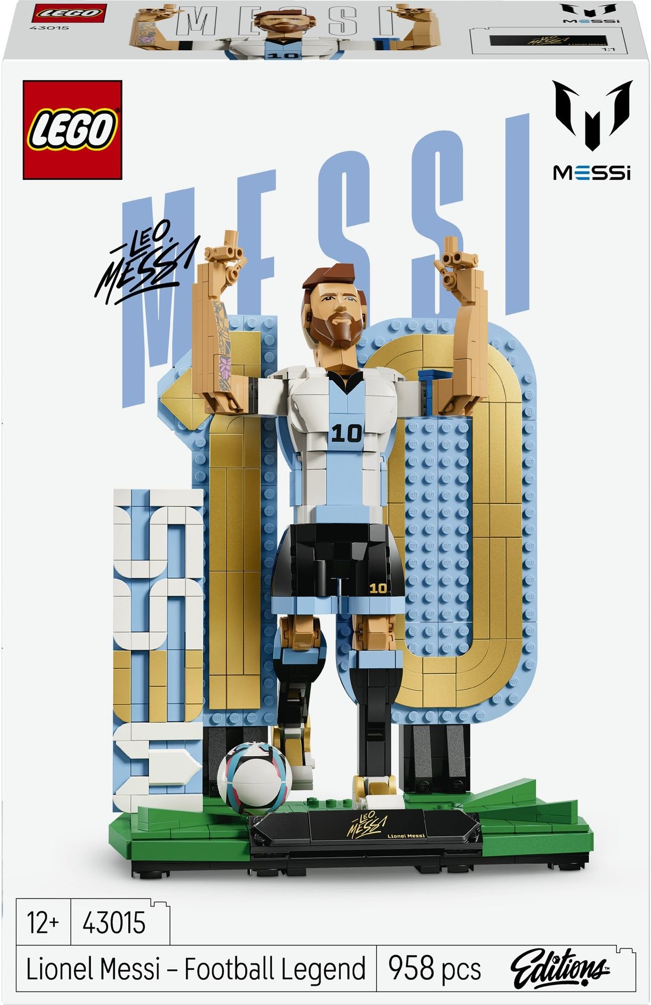 Stwórz hołd dla ikony sportu dzięki zestawowi LEGO Editions Lionel Messi — piłkarska legenda (43015) dla chłopców, dziewczynek i miłośników sportu w wieku od 12 lat. Dzieci mogą podziwiać legendarnego Messiego, budując ten bardzo szczegółowy model i wybierając spośród dwóch opcji budowania. Stworzą figurkę w charakterystycznej dla Messiego pozie zwycięstwa lub dynamicznej pozie w biegu. Messi w geście zwycięstwa wskazuje palcem w stronę nieba po strzeleniu gola, natomiast druga pozycja przedstawia piłkarza dryblującego piłkę na boisku. Zestaw zawiera również duży numer 10, jego kultowy numer na koszulce, napis MESSI, a także tabliczkę z imieniem oraz nowy element z piłką nożną. Po ukończeniu model stanowi wspaniały dodatek do kolekcji gadżetów z Messim i dekorację piłkarską, którą fani mogą z dumą się pochwalić. Zestaw stanowi doskonały prezent urodzinowy lub świąteczny dla chłopców, dziewczynek i fanów Messiego. Ten wciągający projekt zawiera instrukcje dostępne w formie cyfrowej w aplikacji LEGO Builder. Zestaw składa się z 958 elementów. Zestaw LEGO z Lionelem Messim — chłopcy i dziewczynki w wieku od 12 lat mogą stworzyć ikonę sportu dzięki zestawowi konstrukcyjnemu LEGO Editions Lionel Messi - piłkarska legenda (43015) Dwa sposoby ekspozycji — ustaw figurkę Messiego w charakterystycznej pozie zwycięstwa, w której wskazuje palcem w kierunku nieba, lub w dynamicznej pozie podczas dryblowania piłką Model dla fanów Messiego — zestaw zawiera duży numer 10, jego kultowy numer na koszulce, napis MESSI, a także tabliczkę z imieniem oraz nową, formowaną twarz i nowy element z piłką nożną Kolekcjonerska dekoracja piłkarska — ustaw zbudowaną figurkę Lionela Messiego w pokoju lub biurze i poczuj smak zwycięstwa Prezent dla kibiców — ten zestaw to fajny pomysł na prezent dla chłopców, dziewczynek i fanów Leo Messiego na urodziny i inne okazje Kolekcja LEGO Editions — pochwal się swoją sympatią do legendarnych gwiazd piłki nożnej dzięki innym zestawom, sprzedawanym oddzielnie Pomocna dłoń — wschodzące gwiazdy piłki nożnej mogą uzyskać dostęp do cyfrowych instrukcji w aplikacji LEGO Builder, gdzie można śledzić postępy i obracać piłkarskie modele w 3D Wymiary — ten 958-elementowy zestaw z figurką w zwycięskiej pozie ma 27 cm wysokości, 21 cm szerokości i 14 cm głębokości