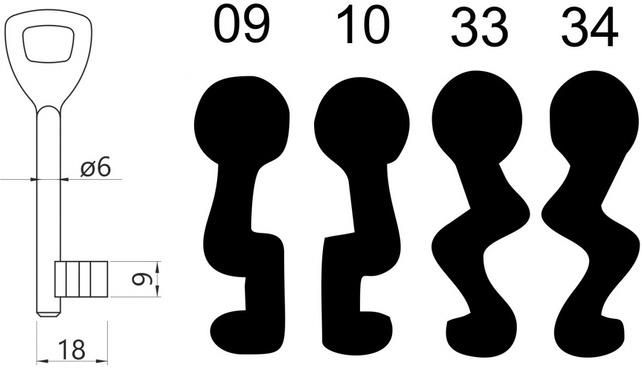 Klucz piórowy do zamków wpuszczanych LOB. Cztery kształty pióra: 9 / 10 / 33 / 34