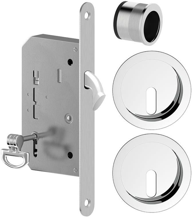 Zamek wpuszczany, hakowy. Kompletny zestaw: zamek hakowy na klucz, blacha zaczepowa, klucz, dwa uchwyty okrągłe, naparstek, elementy montażowe. Wykończenie: chrom / mosiądz / chrom szczotkowany / czarny / nikiel szczotkowany