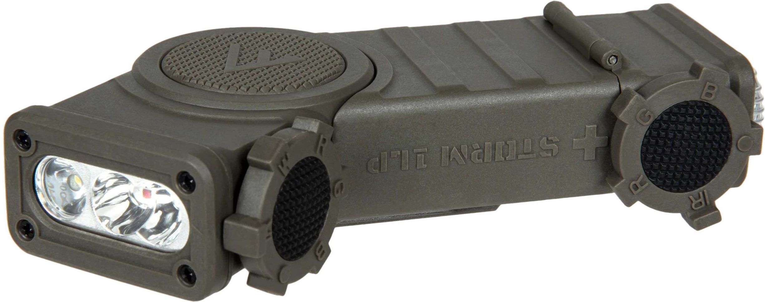Niskoprofilowy system oświetlenia na hełm i kamizelkę taktyczną Storm 1LP. Można go z powodzeniem wykorzystać jako latarkę taktyczną lub kątową. Posiada dwa źródła światła o różnych trybach świecenia. Tryby na świetle kątowym: Dioda IR, światło białe, czerwone, zielone i niebieskie. Źródło kątowe posiada regulacje w pięciu pozycjach od -45° do 45°. Tryby nieruchomego światła: Dioda IR, światło czerwone, zielone i niebieskie. Światło kątowe posiada płaską, gładką szybkę kierunkującą światło, natomiast światło nieruchome, ryflowany klosz rozpraszający światło. Jest w stanie przetrwać upadek z wysokości 2m. Tryb świecenia wybierany jest za pomocą profilowanych pokręteł o kształcie koła zębatego. Moc maksymalna białego światła - 90lm. Zasilanie dwoma bateriami CR123A. Baterie można łatwo wymienić otwierając korpus bez użycia narzędzi. Latarka posiada tryb strobo 1Hz, aktywowany poprzez wybranie i uruchomienie pożądanego trybu i natężenia, a następnie przytrzymanie przycisku. W środku jest uszczelka zwiększająca wodoodporność urządzenia i konektor zapewniający pewną pracę światła kątowego. Latarka posiada oczko do przyczepienia i system szybkiego montażu do hełmu. W zestawie paracord i baterie. Latarka jest kompatybilna z akcesoryjnym uchwytem na rzep do montażu na hełm lub kamizelkę taktyczną T-THL0051. Cechy Latarka taktyczna hełm i kamizelkę Dwa źródła światła - kierunkowe lub rozproszone Kątowe źródło światła z regulacją od -45° do 45° Pokrętło zębate wyboru trybu świecenia Dioda IR, światło białe, czerwone, zielone i niebieskie Tryb stroboskopowy 1Hz Certyfikat IP68 Zasilanie dwoma bateriami CR123A Oczko do zaczepienia lub przeciągnięcia paracordu System szybkiego mocowania na hełmie splitter Dane techniczne Maksymalna moc białego światła 90lm Tryby świecenia Dioda IR Światło białe Światło czerwone Światło zielone Światło niebieskie Stroboskop 1Hz Zasilanie 2x Bateria CR123A Czas pracy Low (10lm): 80h Medium (50lm): 17h 30min High (90lm): 8h 45min Strobo 1 (50lm): 95h Strobo 2 (90lm): 50h Maksymalny zasięg świecenia Low (43cd): 13m Medium (206cd): 29m High (401cd): 40m Wymiary 134x47x28,5mm Waga 101g (bez baterii) Poziom szczelności IP68 Kolor Olive Drab Elementy zestawu Latarka Storm 1LP 2x bateria CR123A Paracord